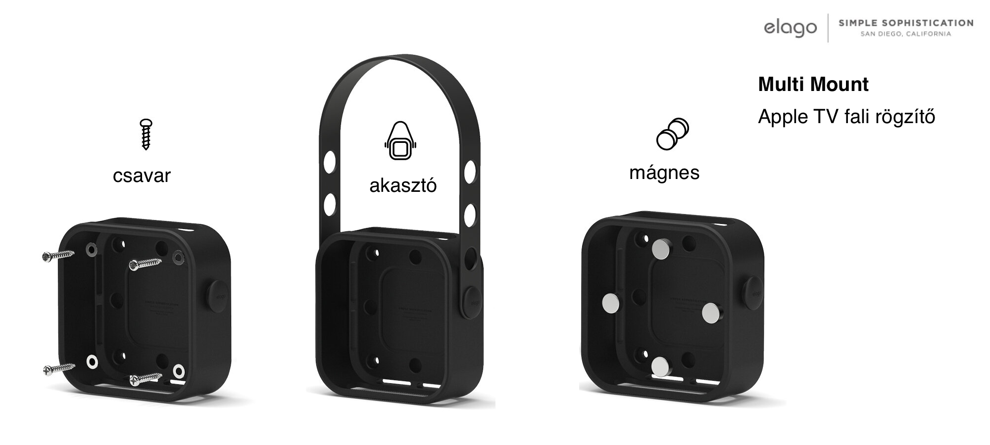 Az Apple TV otthonunk mellett akár irodák, tantermek, tárgyalók alapvető kiegészítője is lehet, ahol kiemelten fontos annak praktikus, jó vételt biztosító és elegáns elhelyezése. Az Elago Multi Mount for Apple TV csomag erre a célra nyújt megoldást egy precízen kialakított keret és háromféle rögzítési opció segítségével.