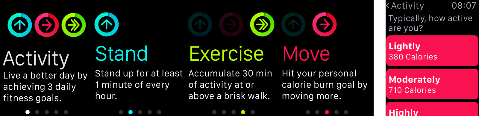 Az óra beállításakor az életvitelünktől függően kalibrálhatjuk azt a célt, amelyet szeretnénk elérni: mind a kalóriaszám, mind az aktív testmozgással töltött idő, mind pedig az állással érintett órák száma szabályozható, vagyis enyhíthetjük vagy szigoríthatjuk valamelyiket - ha például az aktív testmozgás több, akkor ott komolyabb célt is kitűzhetünk. Később az Activity alkalmazás felületén erősen megnyomva a kijelzőt férhetünk hozzá a beállításokhoz, ahol a kalóriaszámot tudjuk módosítani.