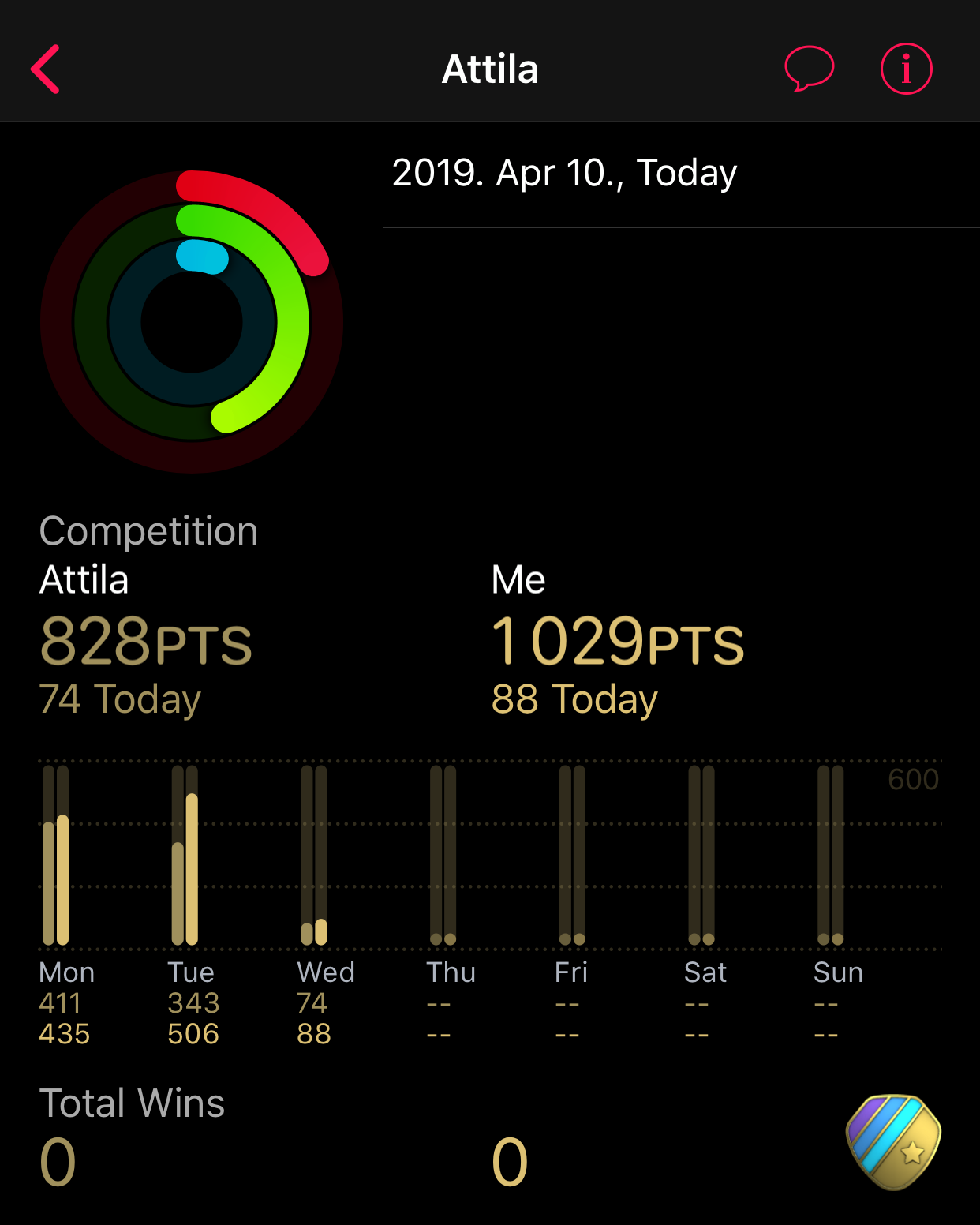 Az Apple Watch érmekkel jutalmazza a tevékenységet, és érmet kap az is, aki veszít a versenyben: a részvételért, egy kihívás teljesítéséért nyer érmet. A győztes külön érmet kap azért, hogy nyert, és ezeket az érmeket lehet gyűjtögetni és megcsodálni, megosztani az Acitivity / Tevékenység alkalmazásban.