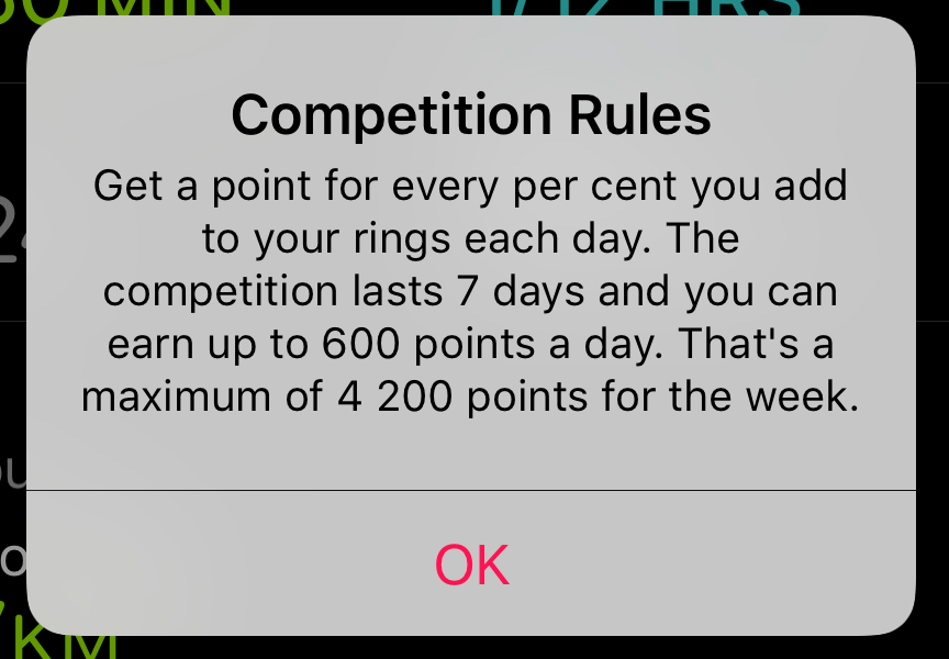 Miután ismerőseinket felvettük a megosztási felületre, akár az Apple Watch felületén, akár az iPhone Activity alkalmazásának felületén lehetőségünk van versenyre kihívni az adott személyt. A verseny az elfogadást követő napon indul, és hét napig tart. A szabályok egyszerűek és igazságosak: nem az elégetett kalóriák versengenek, hanem a saját beállításokhoz mért teljesítmény. Vagyis az 50 kilogrammos hölgyek is versenghetnek a 80 kilogrammos férfi ismerősökkel, akik tömegük okán puszta létükkel több kalóriát fogyasztanak, mivel az Acitivity / Tevékenység alkalmazás arányokat mér, mindenki saját teljesítményéhez mért arányait. Az arányokat alakítják pontokká, és így lehet előnyre szert tenni. Az is előnyös, hogy naponta maximum 600 pontot lehet szerezni, vagyis ha egy lustább ismerős két napon agyonhajszolja magát a győzelemért, akkor csak az a két napja lesz erős, ám ha a kihívója minden nap kiegyensúlyozott jó teljesítményt nyújt, több pontot szerezhet.