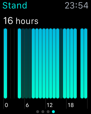 Ez a megközelítés azért jó és eltérő sok más aktivitásfigyelő eszköztől, mert nem lehet letudni a mozgást félóra alatt reggel, és élni abban a tudatban, hogy tunyulhatunk, mert már mozogtunk eleget. Az Apple Watch Activity alkalmazása legalább 12 órát átölel, mivel a kék kör csak akkor teljesedik ki, ha legalább 12 olyan óra van, amelyben legalább egyszer felálltunk és mozogtunk. Felállni ülő helyzetünkből munka közben azért fontos, mert a vérkeringésünk szempontjából előnyös, ha néhány percet mozgunk. Munka közben azonban ezt tipikusan elfelejtjük, vagy elpörögnek az órák, és nem is tűnik fel, hogy már 3 órája ülünk egy helyben - csak azt érezzük, hogy zsibbadás van a lábunkban, és már sehogy sem jó ülni. Az Apple Watch ezt az élethelyzetet szeretné kizárni az életünkből azzal, hogy ha nem mozdulunk meg, nem állunk fel, akkor figyelmeztet - ideje egy kicsit mocorogni.