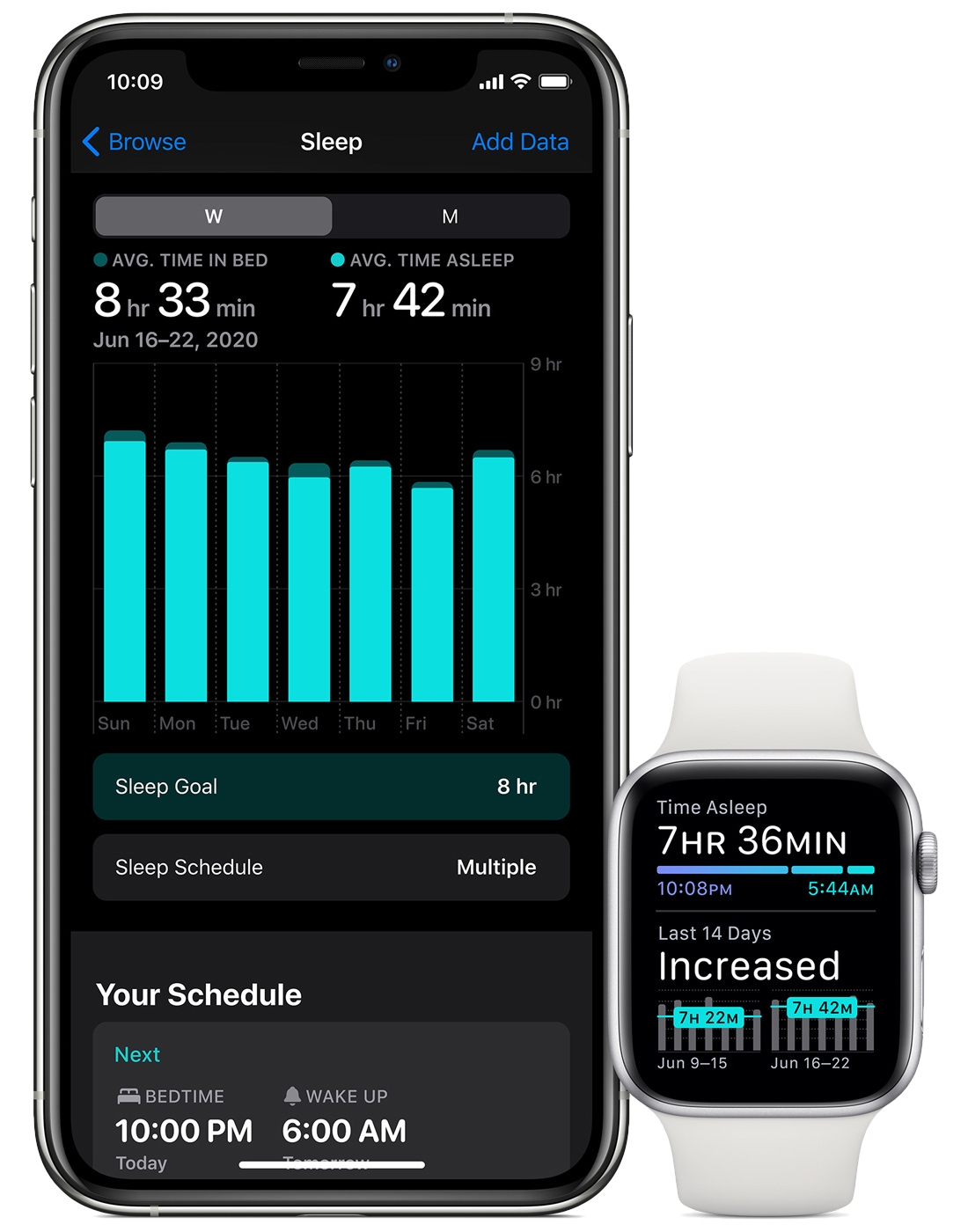 A Sleep / Alvás alkalmazás a watchOS 7 rendszerben mutatkozott be az iOS 14 Health / Egészség program társaként, amely ráadásul a Clock / Óra alkalmazásunkkal is együttműködik, és ébresztést képes elhelyezni a telefonon megadott ébresztő időpontok között.