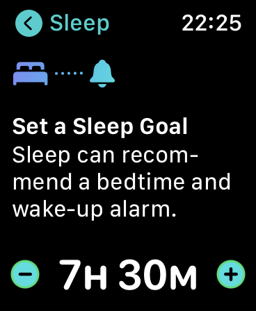 Az első felületen tudjuk megadni, hogy hány órát kívánunk aludni egy éjjel: ez alapból 8 óra, de aki délután is pihen vagy nem hosszan alvó, természetesen ennél rövidebb alvási időt is beállíthat a mínusz gomb lenyomásával, amely 30 percet csíp le az alvási időből. A plusz ezzel ellentétesen 30 perccel toldja meg a kívánt alvási időt. Az óra ébredés után elismerően jelez, ha teljesítettük az alvás célunkat. A Sleep / Alvás alkalmazás finoman felhívja a figyelmet arra is, hogy az ágyban töltött idő, amit az iPhone használatával töltünk, nem számít bele az alvásba, tehát azt is figyelembe veszi majd a kalkulálás során.