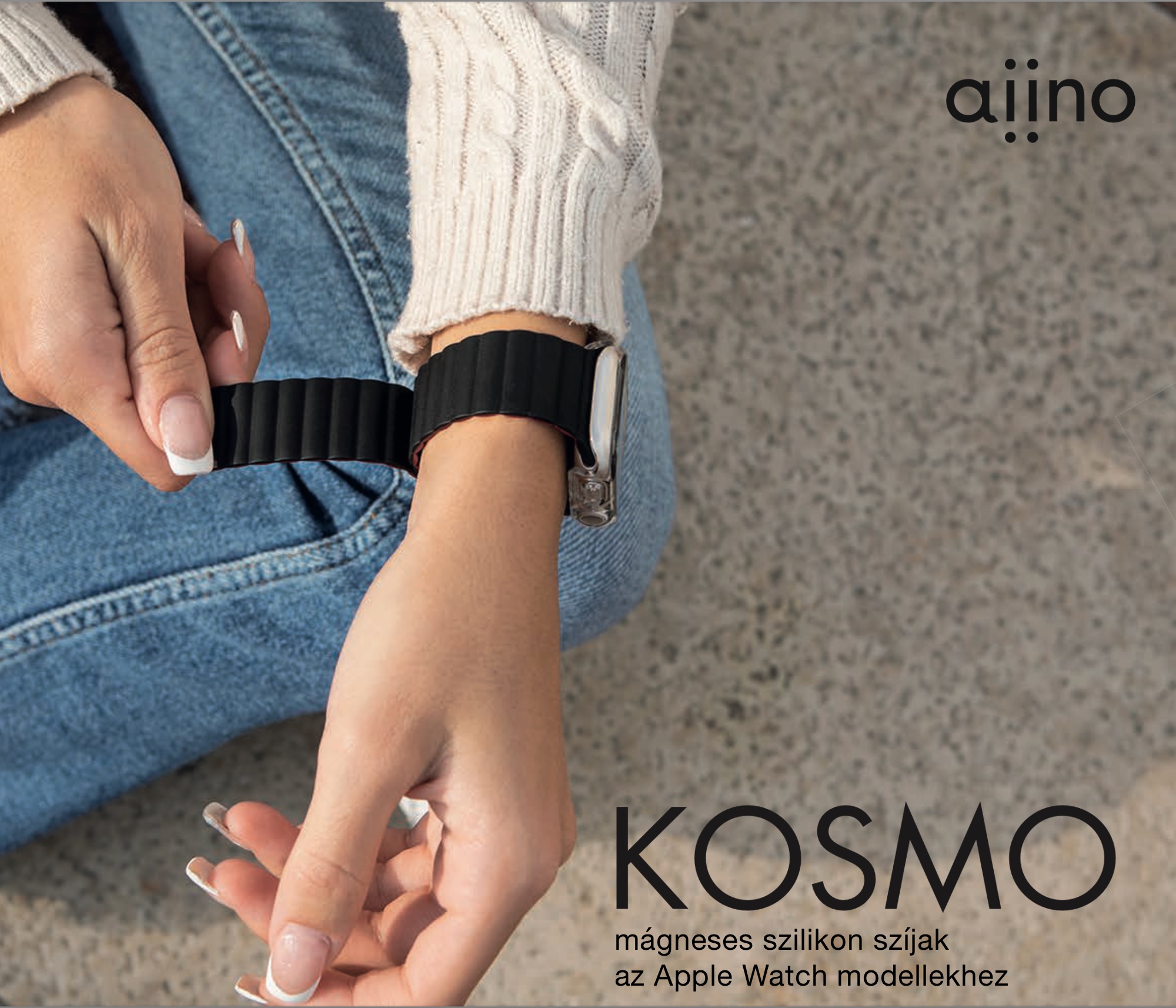 Az AIINO mágnesesen záródó, strapabíró és kellemesen puha tapintású szilikon alapanyagból alkotta meg a Kosmo névre hallgató óraszíj termékcsaládját. A mágneses illesztés révén a szíj rendkívül stabilan áll, ugyanakkor használata az Apple szíjaktól megszokottól eltér, mivel két részből áll, amelyet egymásra kell hajtani a rögzítéshez. Vagyis nincsen bonyodalmas átfűzési igény, ami szükségtelen kopásnak tenné ki az anyagot, csupán a stabil, ugyanakkor finom mágneses illeszkedés. Ennek jóvoltából stabilan áll minden kézen, és jól illeszkedik a véroxigénszint-méréshez és az EKG elvégzéséhez is.