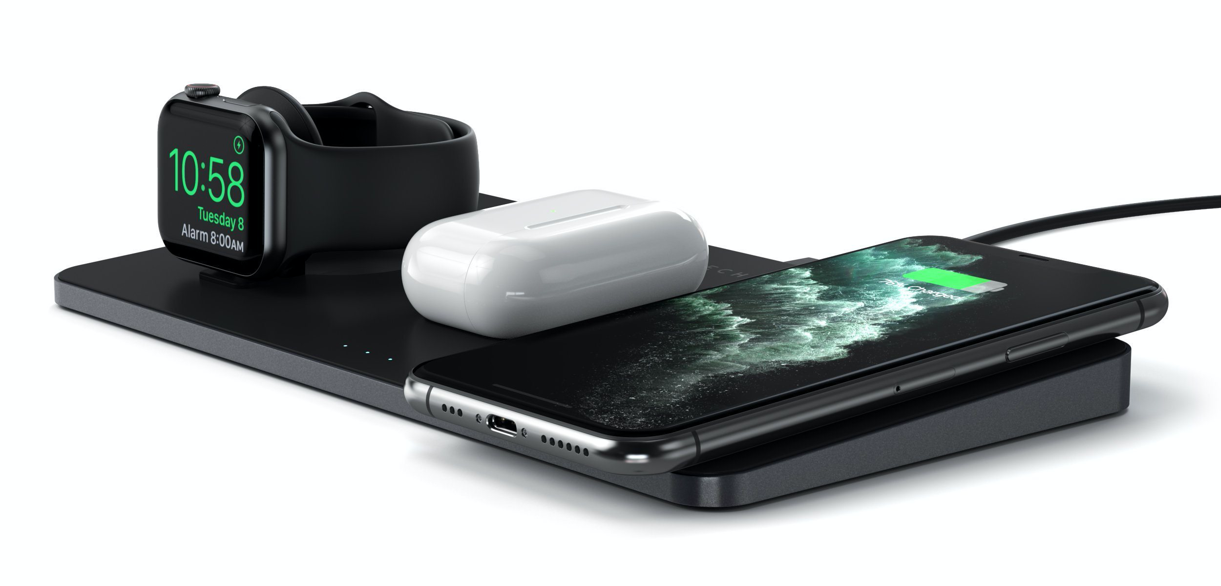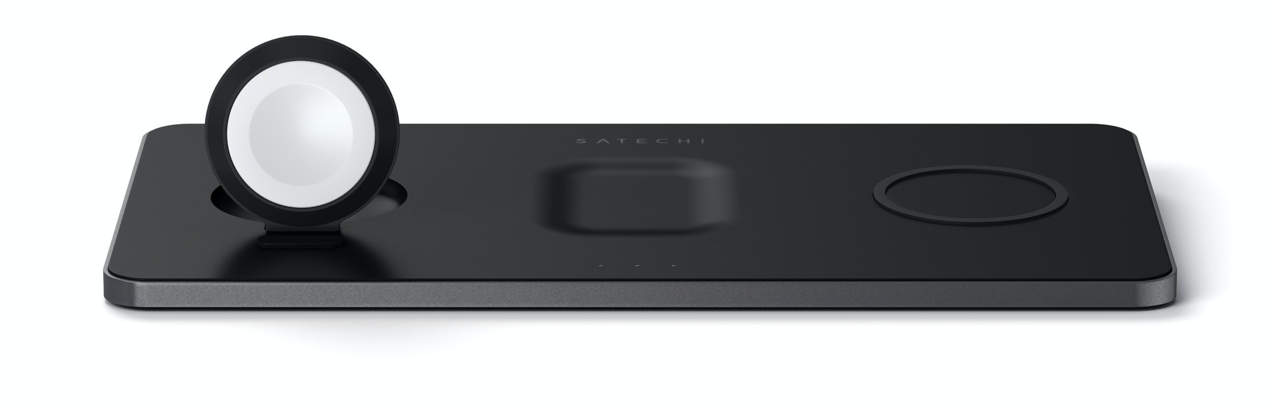 A Satechi Trio Wireless Charging Pad a Qi töltő szabványt támogató megoldás, amely kettő darab Qi töltő résszel és egy speciális Apple Watch mágneses töltővel rendelkezik. Utóbbi az Apple által kifejlesztett, kimondottan az órával együttműködő töltő korong, amely kihajtható a termék síkjából annak érdekében, hogy az éjjeli szekrény módot is támogassa, vagyis az Apple Watch fekete alapon zöld felirattal jelenítse meg a pontos időt az asztalra merőleges pozícióban állva.