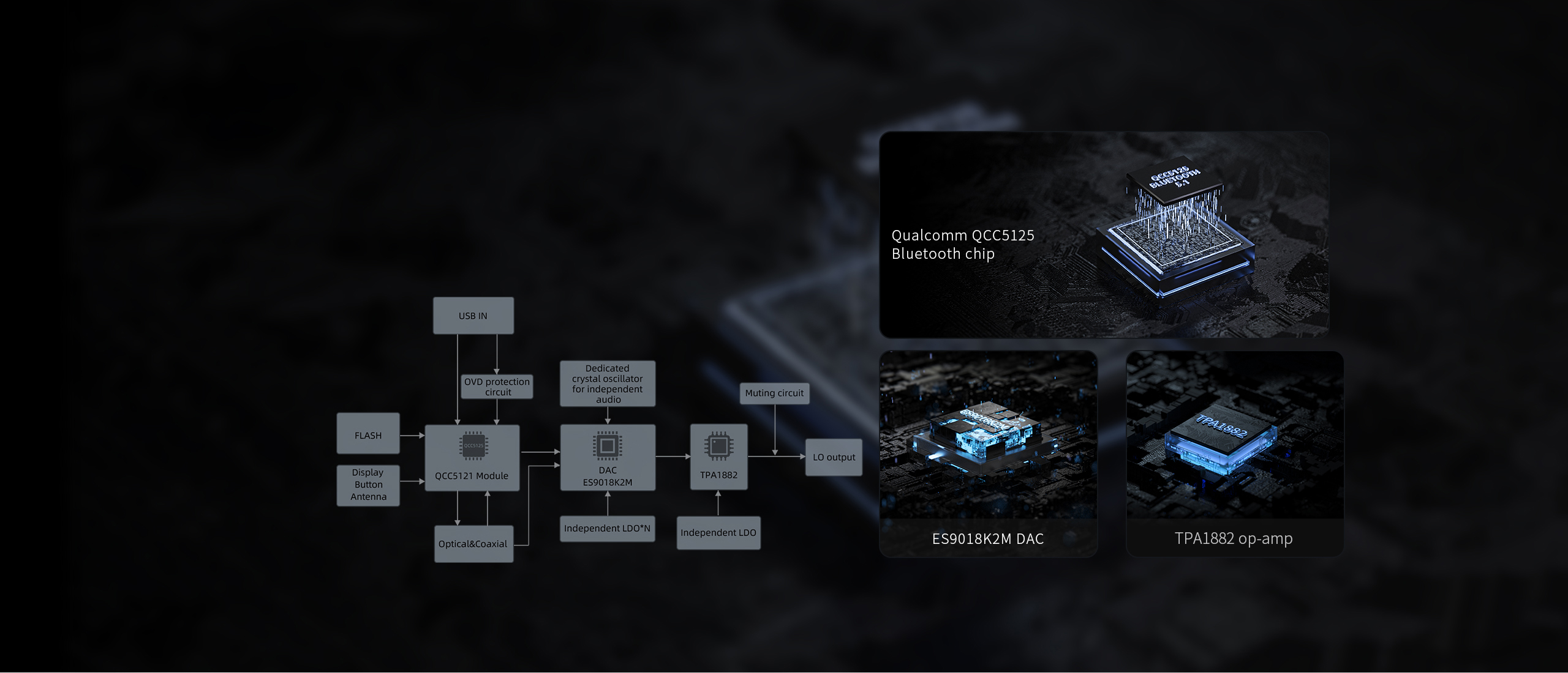 Az ES9018K2M-es DAC chip az azt körülvevő áramköri elemekkel tökéletes digitális-analóg átalakítást végez, hogy a végeredmény tökéletes HiFi hangzást biztosítson. Az analóg hangjelet egy TPA1882 erősíti a kívánt jelszintre.