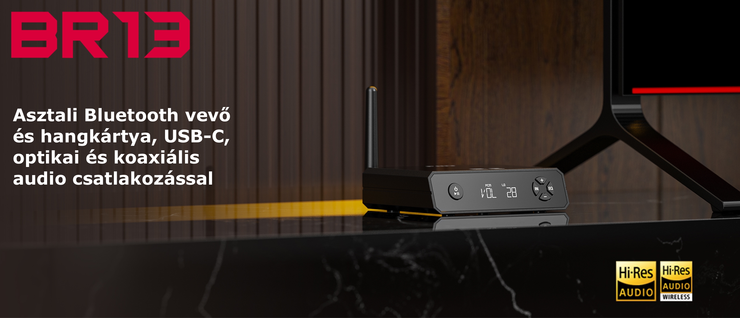 Ebben a módban a Bluetooth képes hangforrásból (okostelefonból, tévéből, számítógépből stb.) Bluetooth kapcsolaton keresztül érkezik a hang a BR13-ba. A BR13 analóg vonali vagy digitális optikai/koaxiális kimenetét csatlakoztathatjuk egy erősítőhöz vagy aktív hangfalhoz! A BR13 két forrást tud párhuzamosan kezelni. A két párosított eszköz közül azt használja aktuális forrásként, amely felől zenei jelfolyamot érzékel. Két aktív jelfolyam esetén csak akkor vált a második forrásra a BR13, ha az elsőn megáll a jelfolyam, és fordítva.