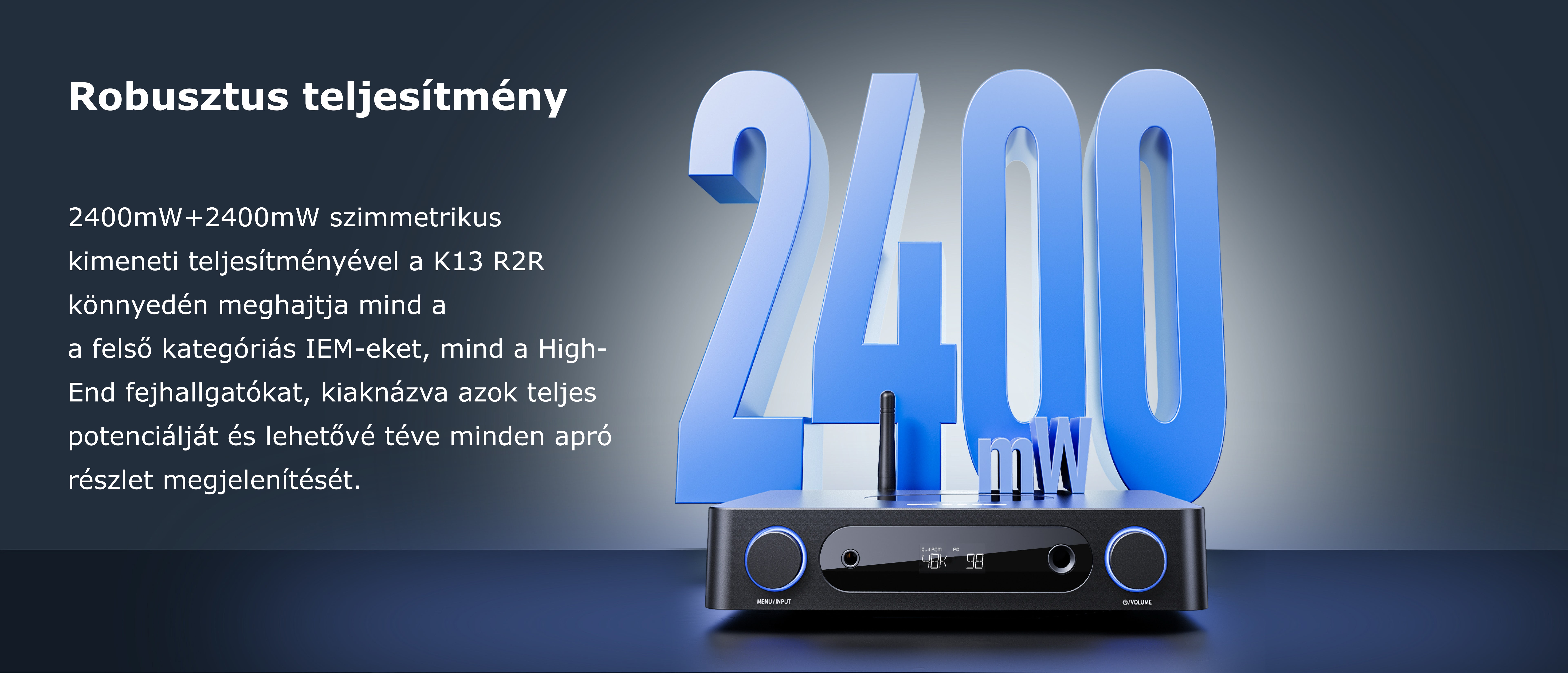 Teljesítmény: 2*2400 mW (32 Ω, szimmetrikus kimenet)