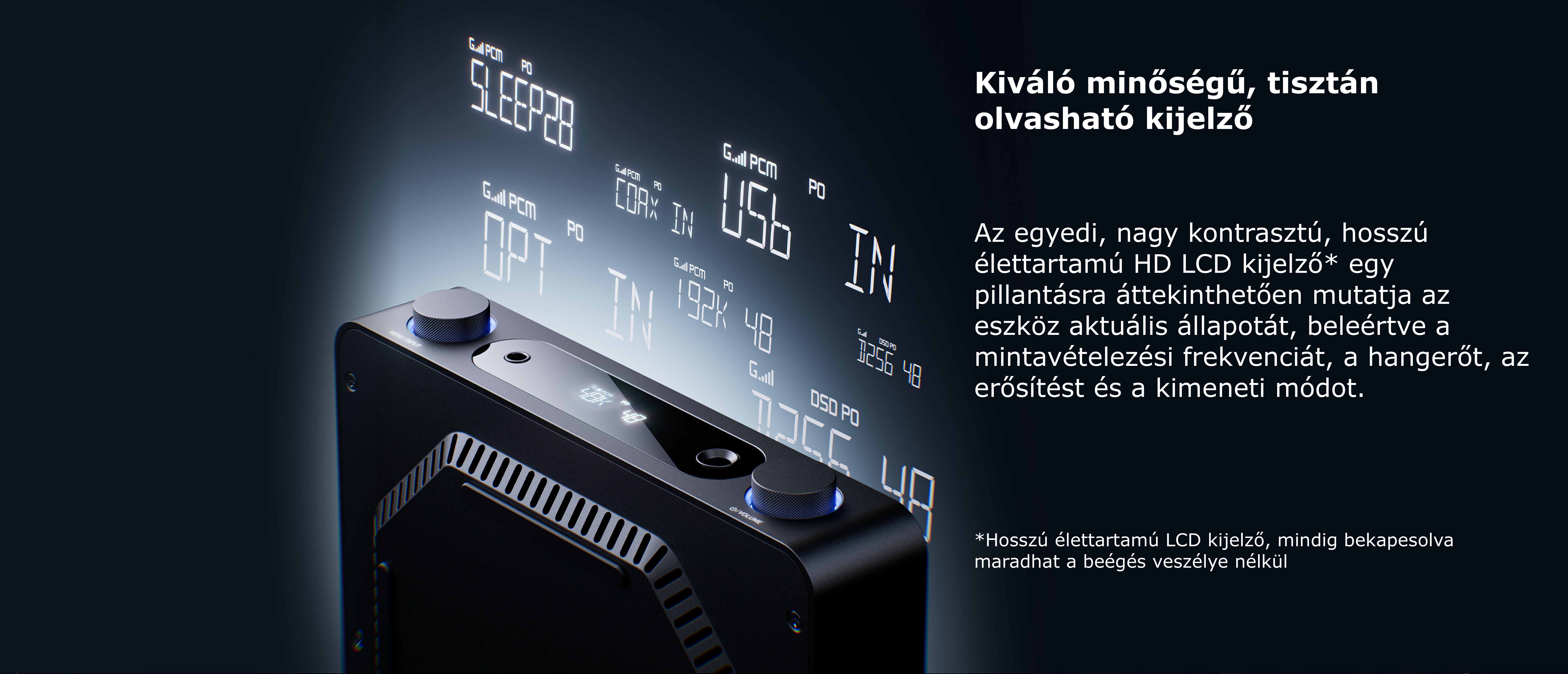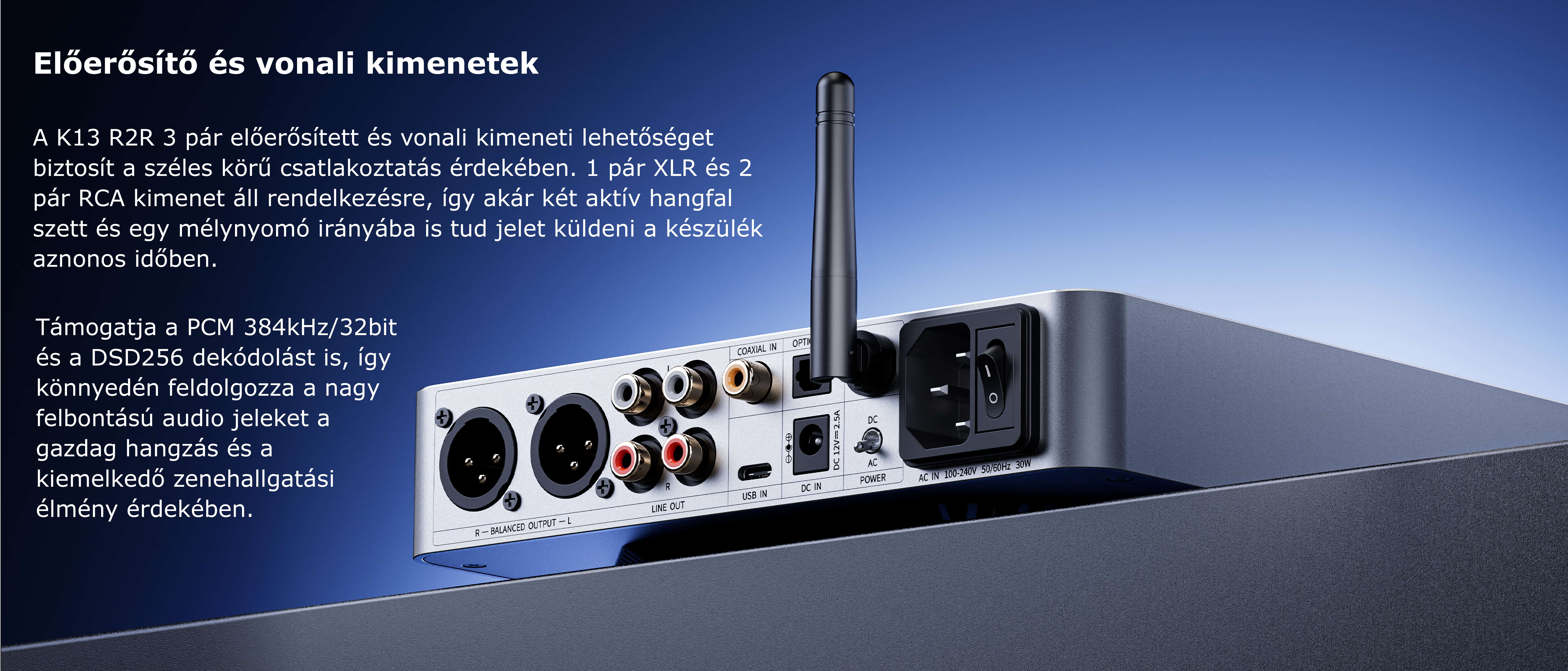 Csatlakozók: 6.35 mm-es fejhallgató kimenet, 4.4 mm-es szimmetrikus kimenet, 3 pólusú XLR szimmetrikus kimenet pár, koaxiális bemenet, optikai bemenet, 2 USB-C csatlakozó, Bluetooth, 2 pár RCA vonali kimenet