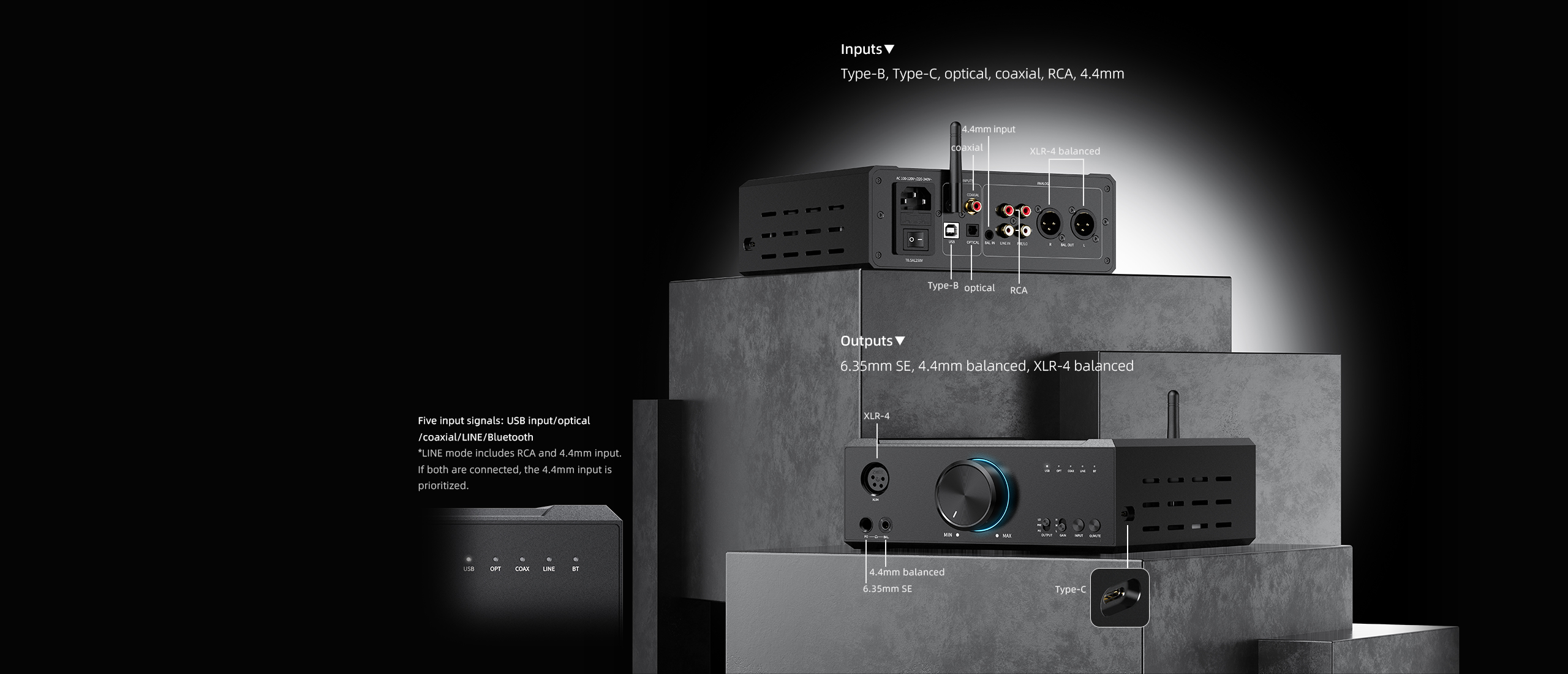 Csatlakozók: Vonali ki-/bemenet (RCA), szimmetrikus vonali XLR kimenetek, 4.4 mm-es szimmetrikus vonali bemenet, optikai (Toslink) és koaxiális (RCA) bemenet, USB-B és USB-C audio bemenetek, 6.35 fejhallgató kimenet (3.5 mm-es adapter mellékelve) 4.4 mm-es szimmetrikus fejhallgató kimenet, XLR4 szimmetrikus fejhallgató kimenet,