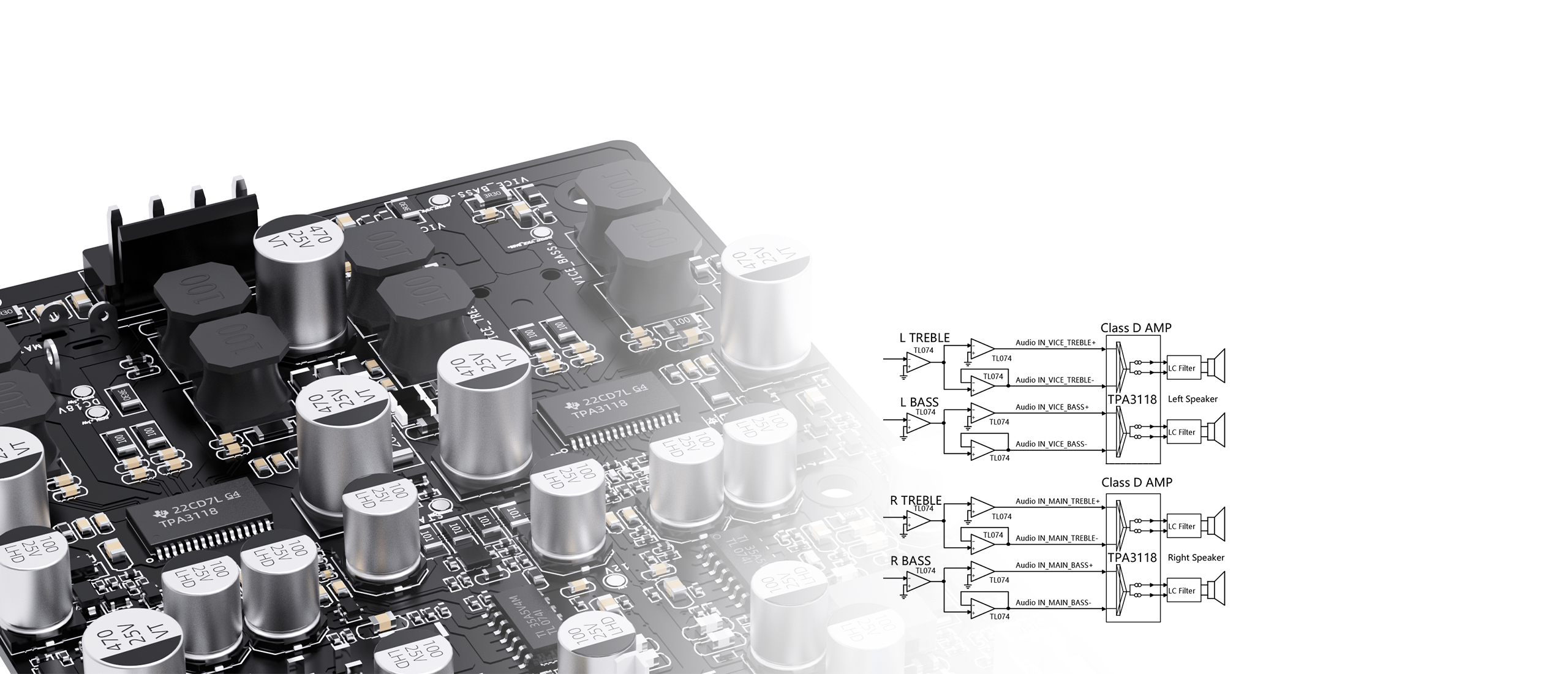 Az SA1 a FiiO SP3/SP3 BT hangfalakhoz hasonlóan két darab Texas Instruments TI TPA3118 Class D digitális erősítő chippel van felszerelve. A TPA 3118 magas konverziós hatékonysággal és alacsony zajszinttel rendelkezik, ami biztosítja az audiojel tisztaságát.