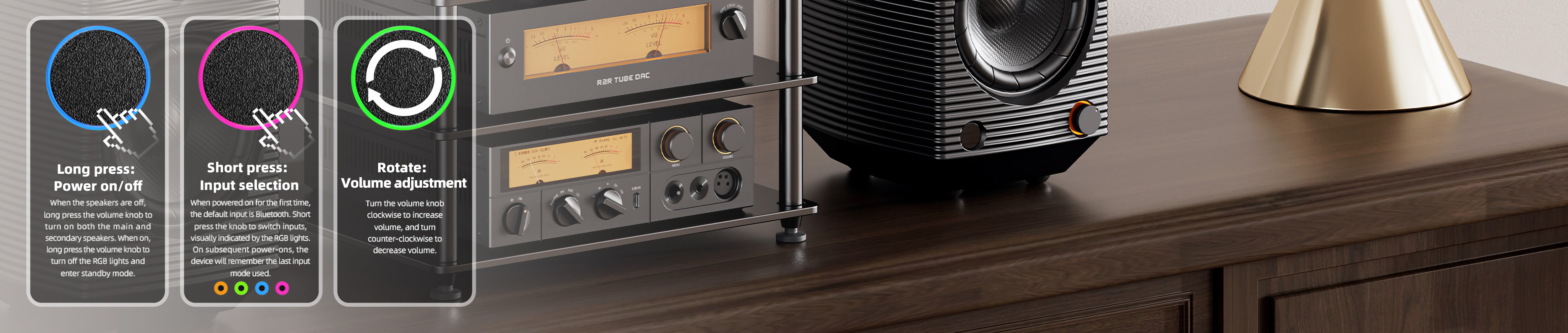 Rövid nyomás - források közötti választás (az RGB led fényének színkódja alapján lehet tudni, hogy melyik van kiválasztva)