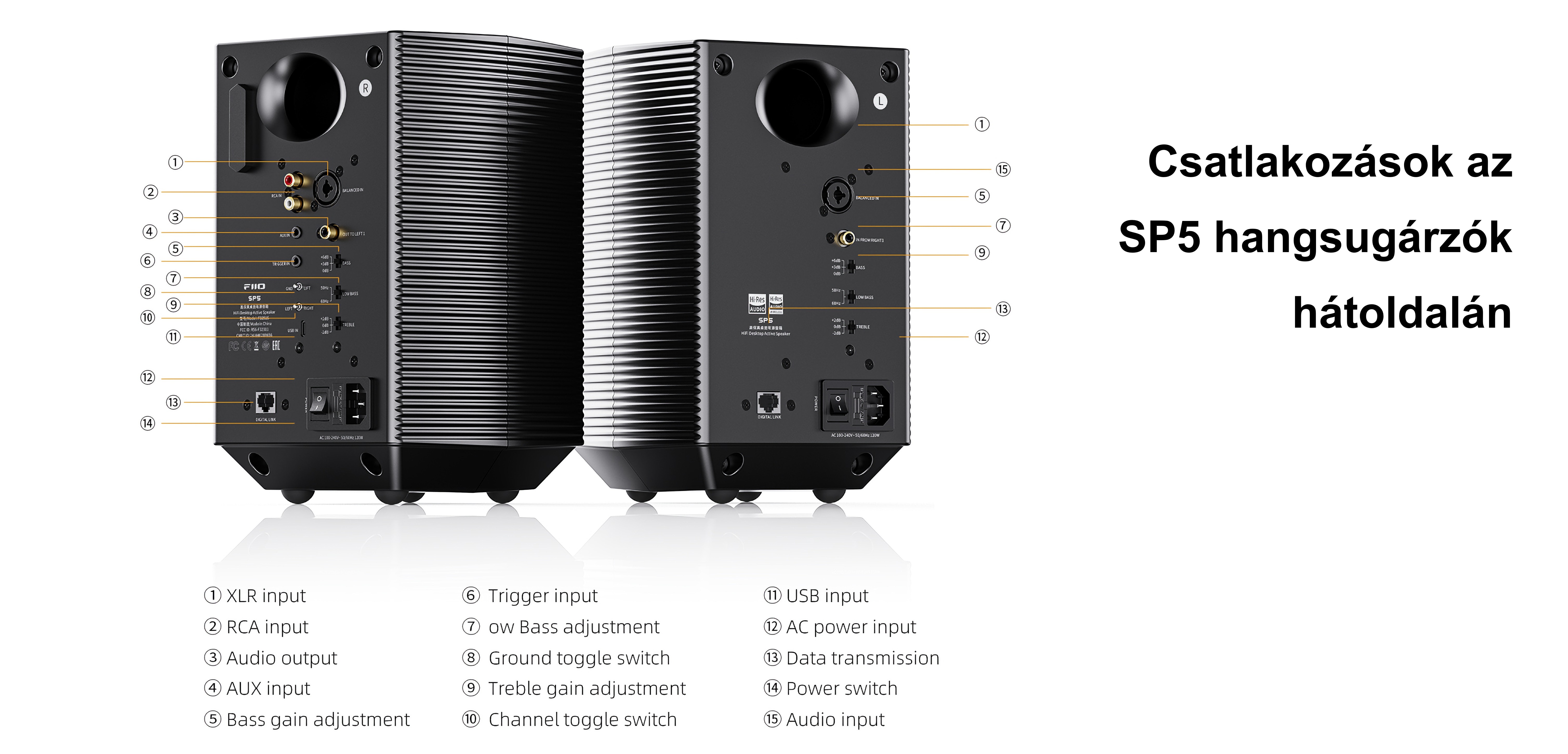 Analóg bemenetek: XLR (mindkét hangsugárzón), 3,5 mm jack (csak a fő hangsugárzón), sztereó RCA (csak a fő hangsugárzón)