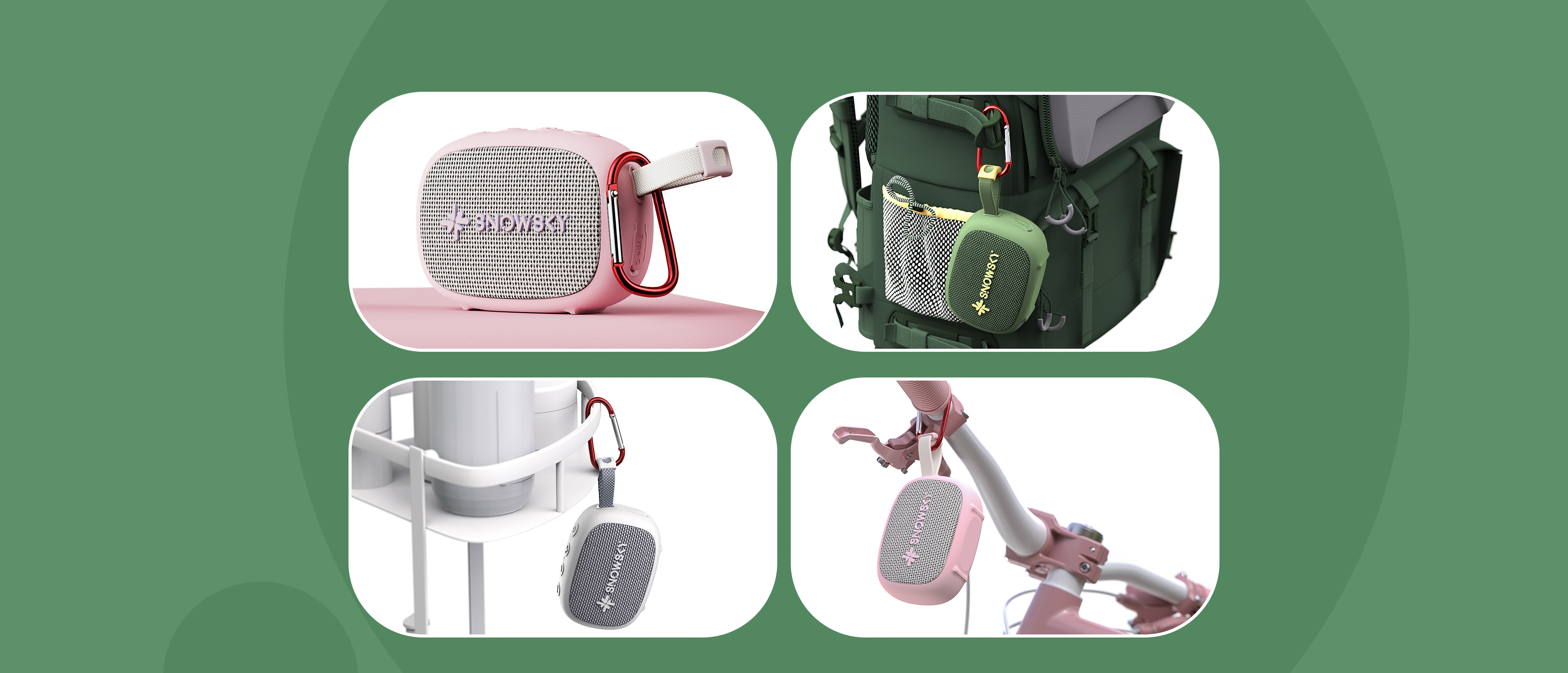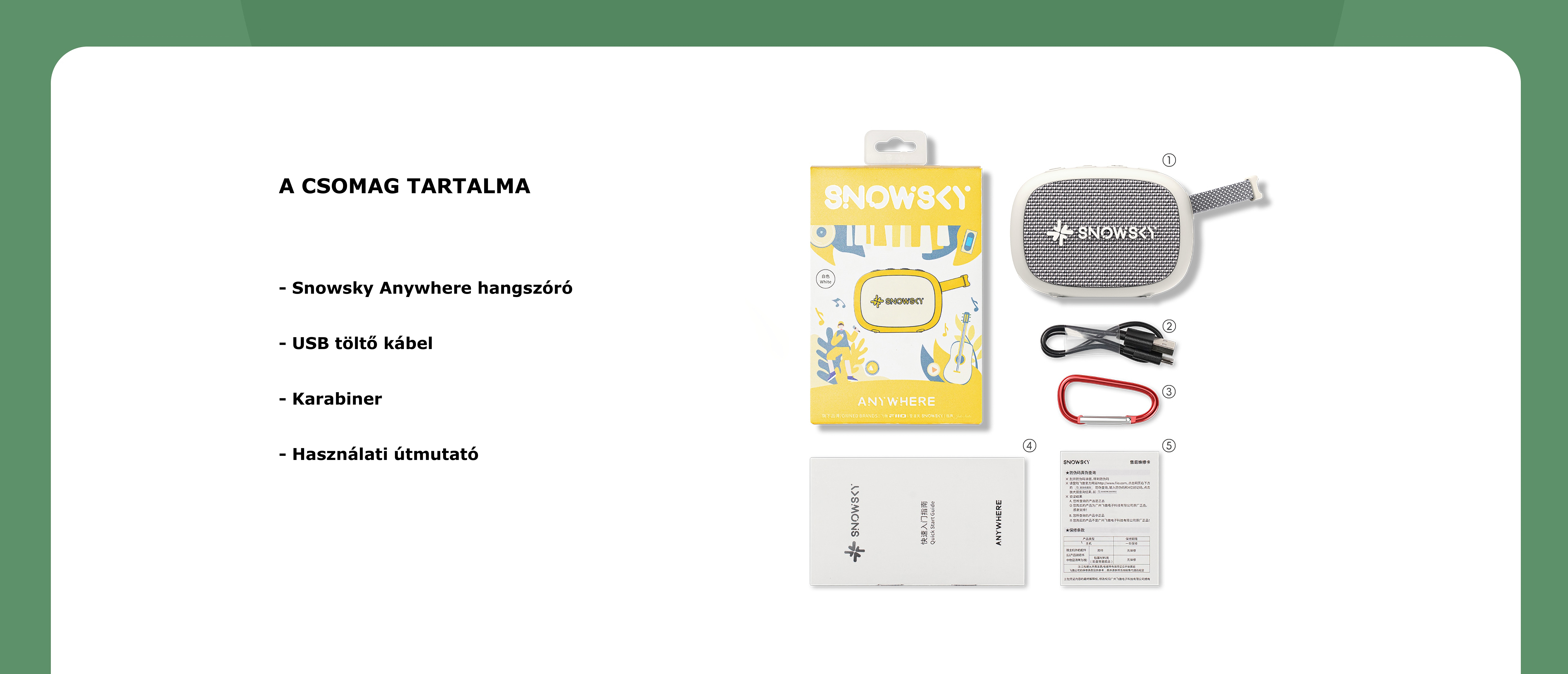 A Snowsky Anywhere kicsi és könnyű: mindössze 190 gramm. A szilikon borítás és a lekerekített sarkok tapintása kellemes. Emellett a mágneses alappal rendelkező kompakt kialakítás lehetővé teszi, hogy fémfelületekre rögzítsd, például hűtőszekrényre vagy fémoszlopra, de akár fel is akaszthatod az erre a célra kialakított fül segítségével. A csomagban megtalálható karabínerrel tovább bővül a rögzítési lehetőségek sora.