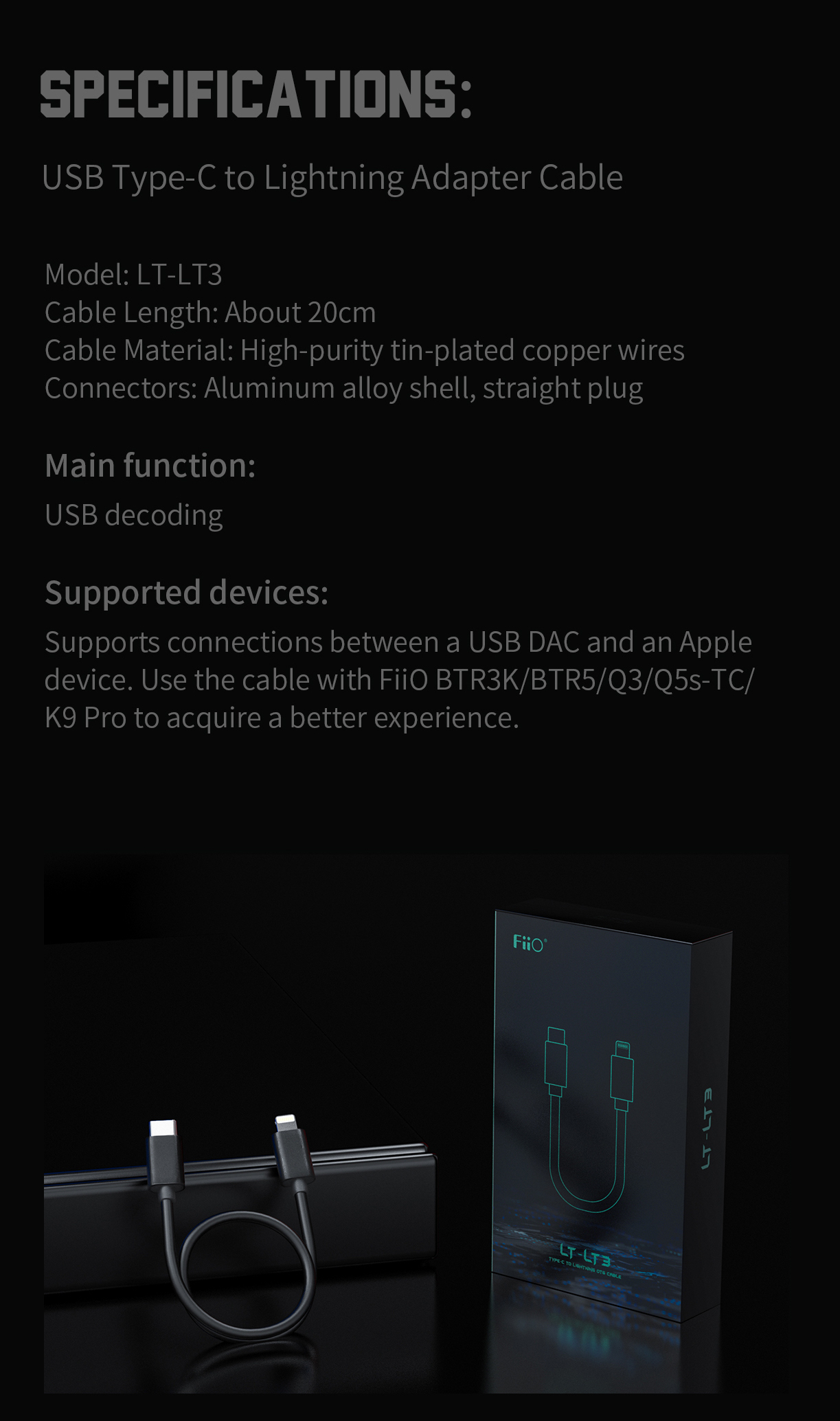 A FiiO a hangtechnikai kiegészítőket használók nagy örömére megelégelte, hogy az USB-C alapú digitális/analóg átalakítóit csak bonyodalmasan lehet iPhone készülékekre csatlakoztatni, és megalkotta az iparág első kifejezetten zenei célokra született USB-C - Lightning utazókábelét, amely adapterek nélkül támogatja számos kiegészítő csatlakoztatását.
