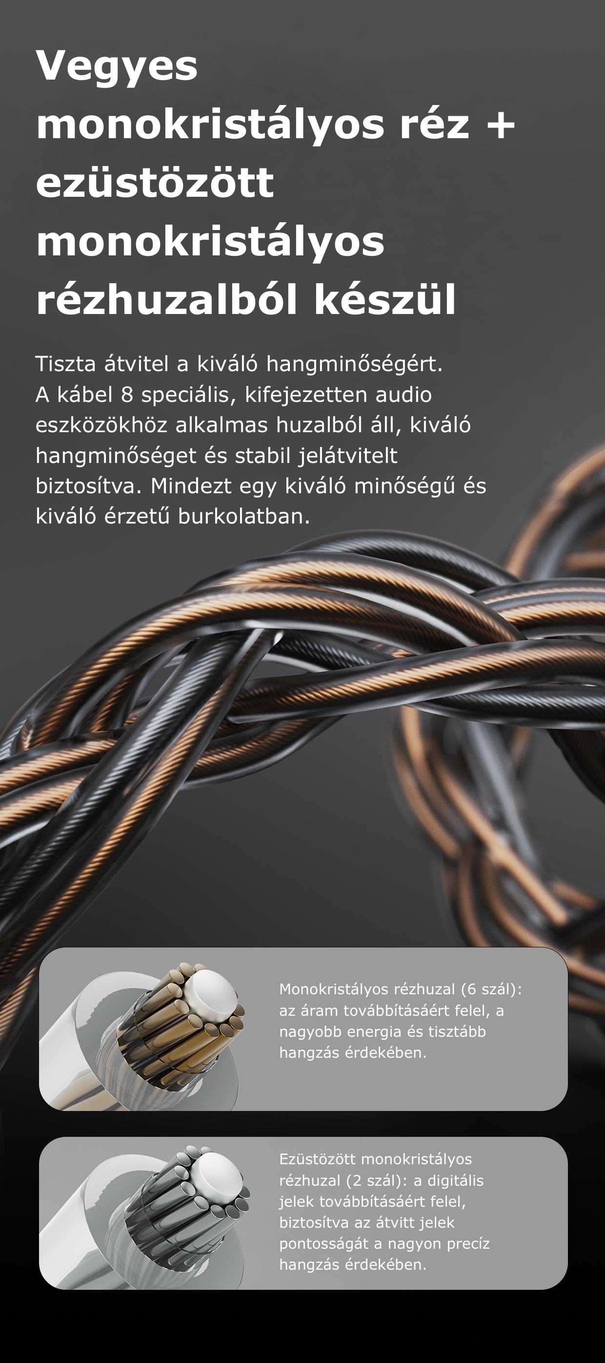 A monokristályos réz vezetők (6 szál) az áramellátásért felelősek, nagyobb energiatovábbítást és tisztább hangzást eredményeznek.