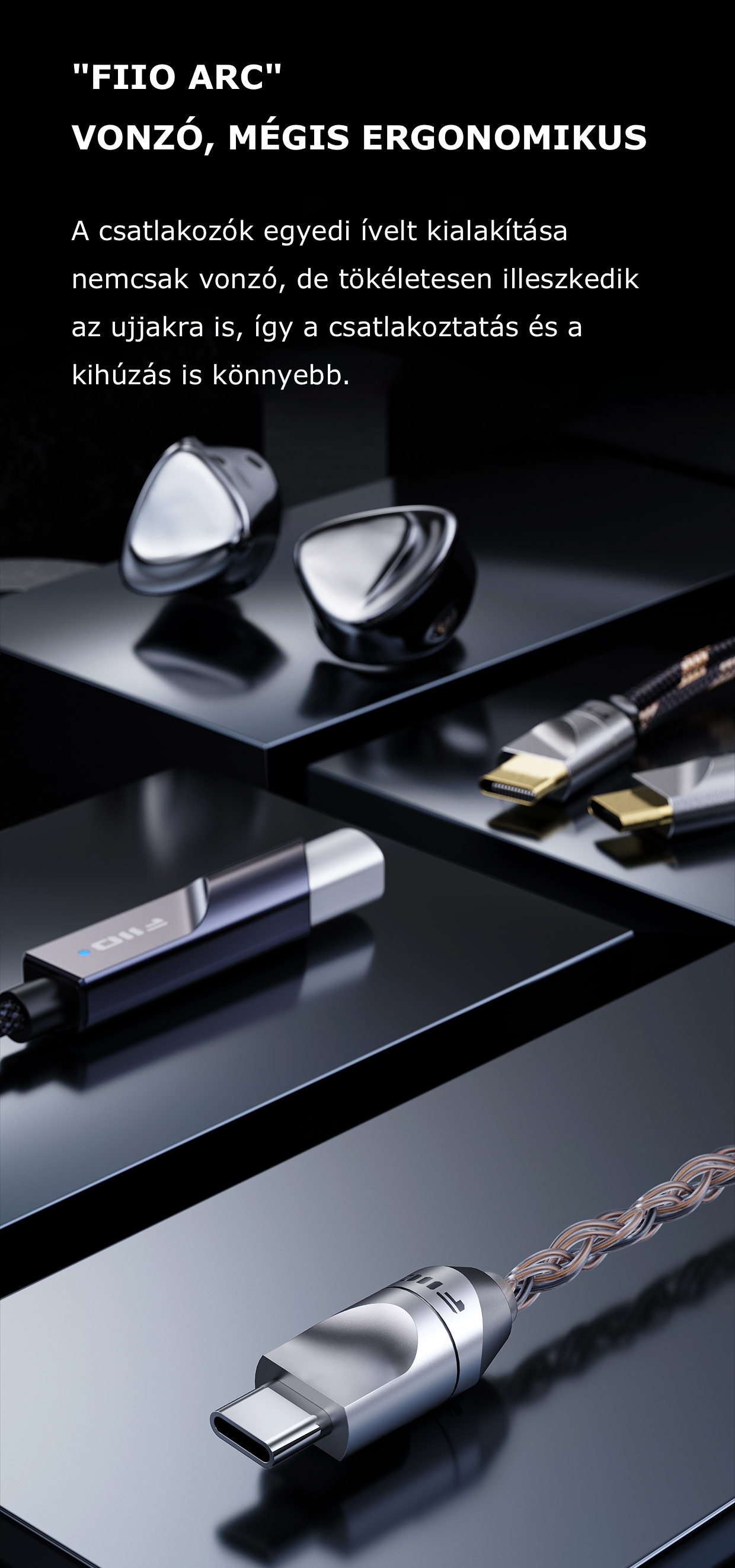 „FIIO Arc” dizájn: A csatlakozók íves kialakítása nemcsak látványos, hanem ergonomikus is: kényelmes fogást ad, megkönnyítve a csatlakoztatást és lecsatlakoztatást.