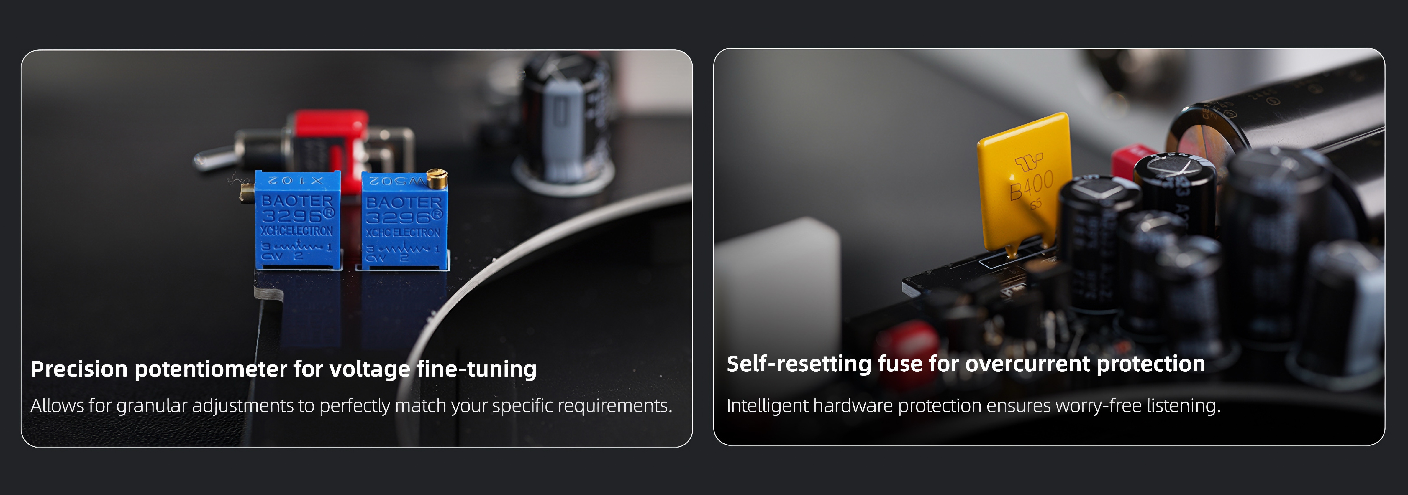 Két nagyáramú IRFZ34NPBF MOSFET-et alkalmazott a gyártó a párhuzamos kapcsolásban a belső ellenállás csökkentése érdekében. Az eredmény: javított dinamikatartomány és a zenei részletek hű megőrzése. A teljesen diszkrét szabályozó áramkör és a nagy pontosságú referencia révén ultra-alacsony zajszintet és villámgyors tranziensekre adott választ értek el – mindezt minimális hőtermelés mellett.