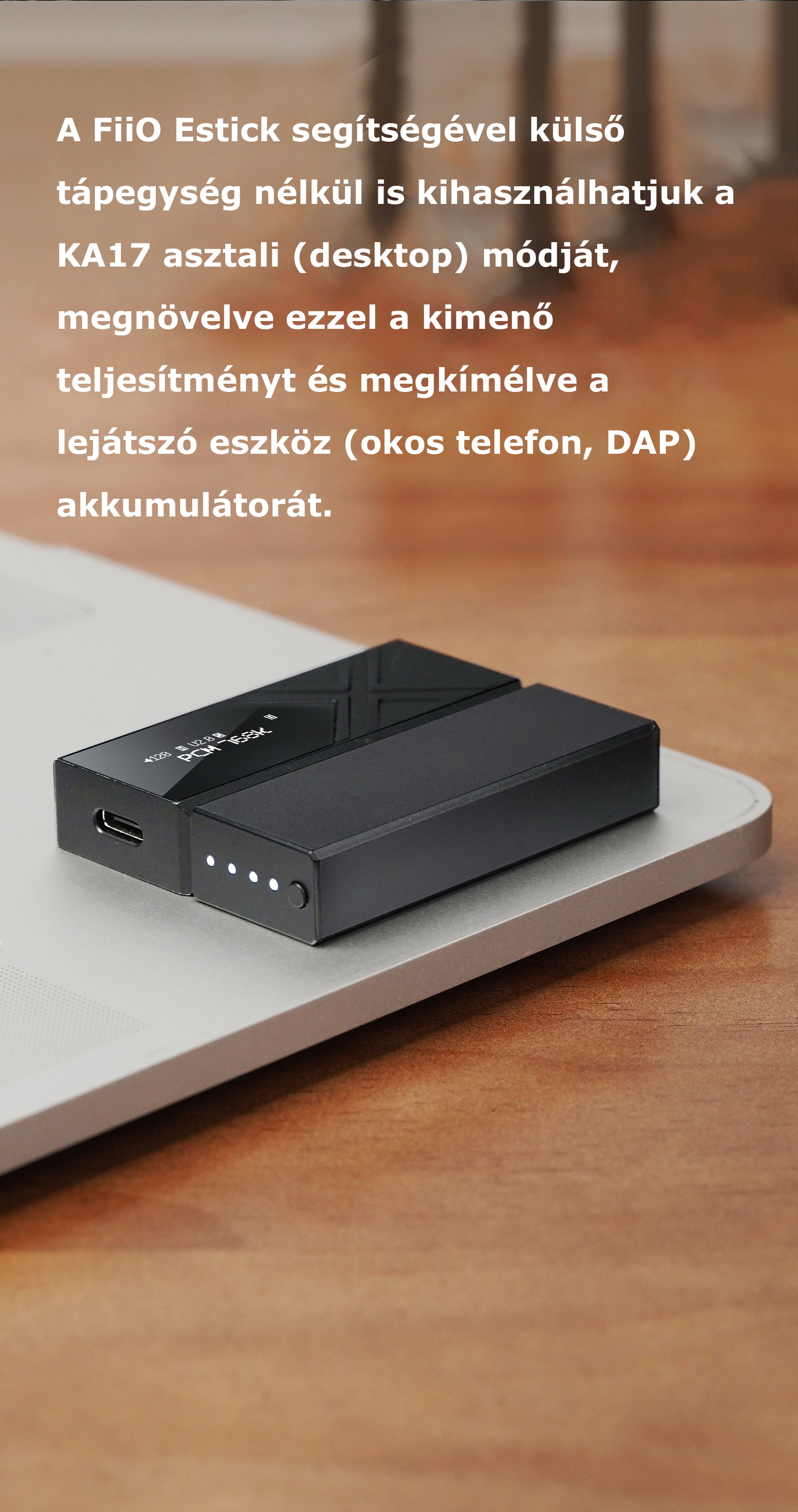 A FiiO Estick segítségével külső tápegység nélkül is kihasználhatjuk a KA17 asztali (desktop) módját, megnövelve ezzel a kimenő teljesítményt, és megkímélve a lejátszó eszköz (okostelefon, DAP) akkumulátorát.