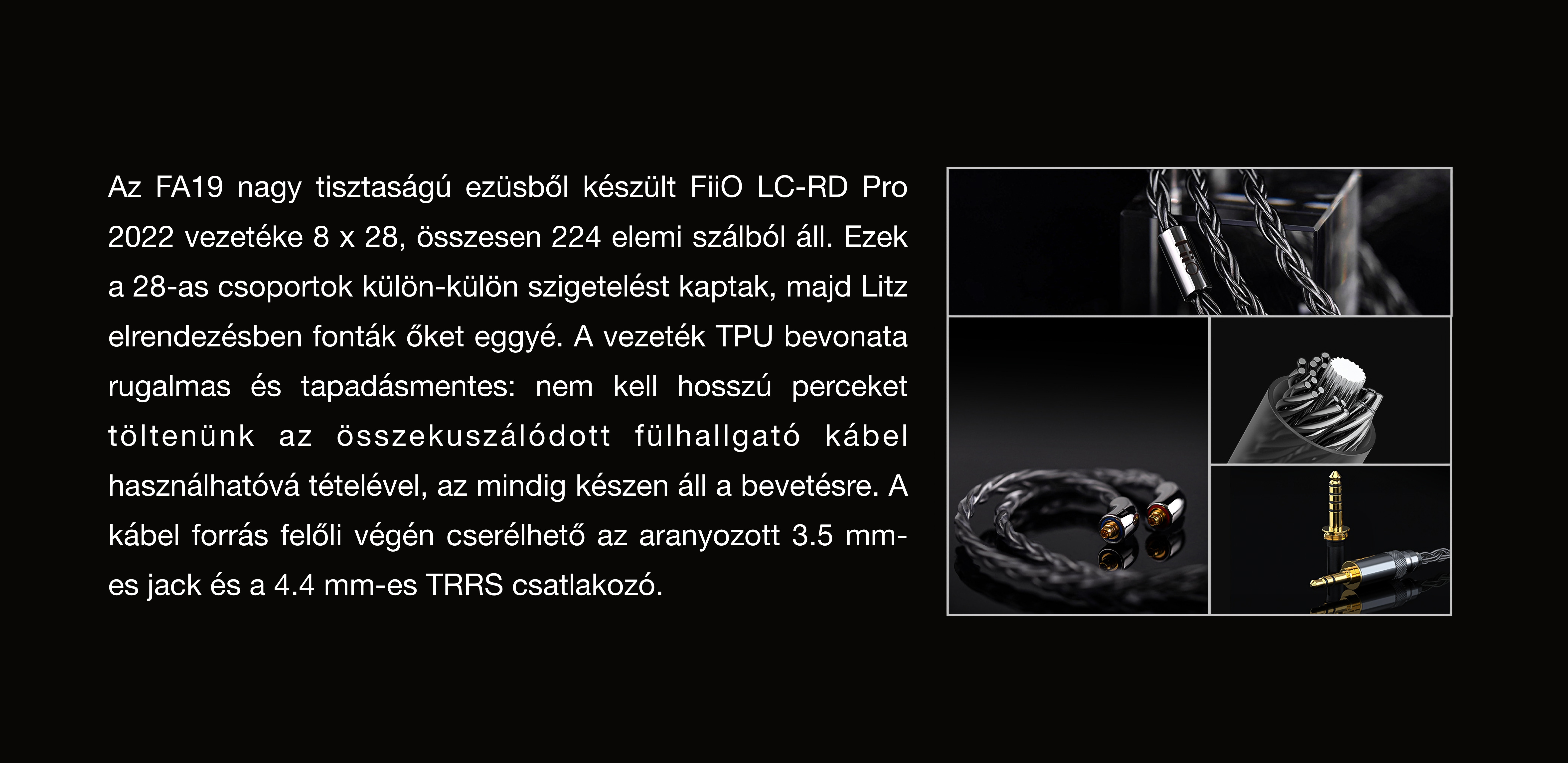 Az FA19 nagy tisztaságú ezüstből készült FiiO LC-RD Pro 2022 vezetéke 8 x 28, összesen 224 elemi szálból áll. Ezek a 28-as csoportok külön-külön szigetelést kaptak, majd Litz elrendezésben fonták őket eggyé. A vezeték TPU bevonata rugalmas és tapadásmentes: nem kell hosszú perceket töltenünk az összekuszálódott fülhallgató használhatóvá tételével, az mindig készen áll a bevetésre. A kábel forrás felőli végén cserélhető az aranyozott 3.5 mm-es jack és a 4.4 mm-es TRRS csatlakozó.