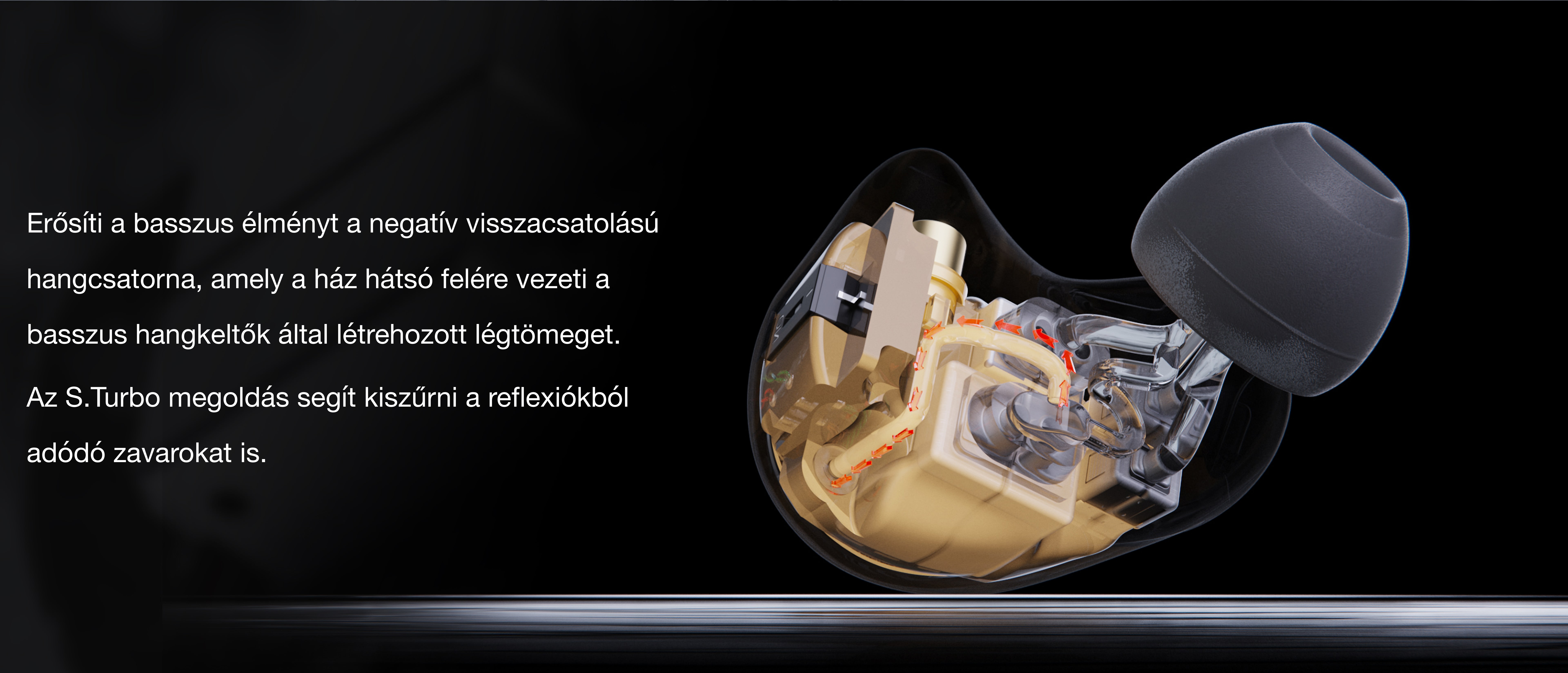 Tovább erősíti a basszus élményt a negatív visszacsatolású hangcsatorna, amely a ház hátsó felére vezeti basszus hangkeltők által létrehozott légtömeget. Az S.Turbo megoldás segít kiszűrni a reflexiókból adódó zavarokat is.