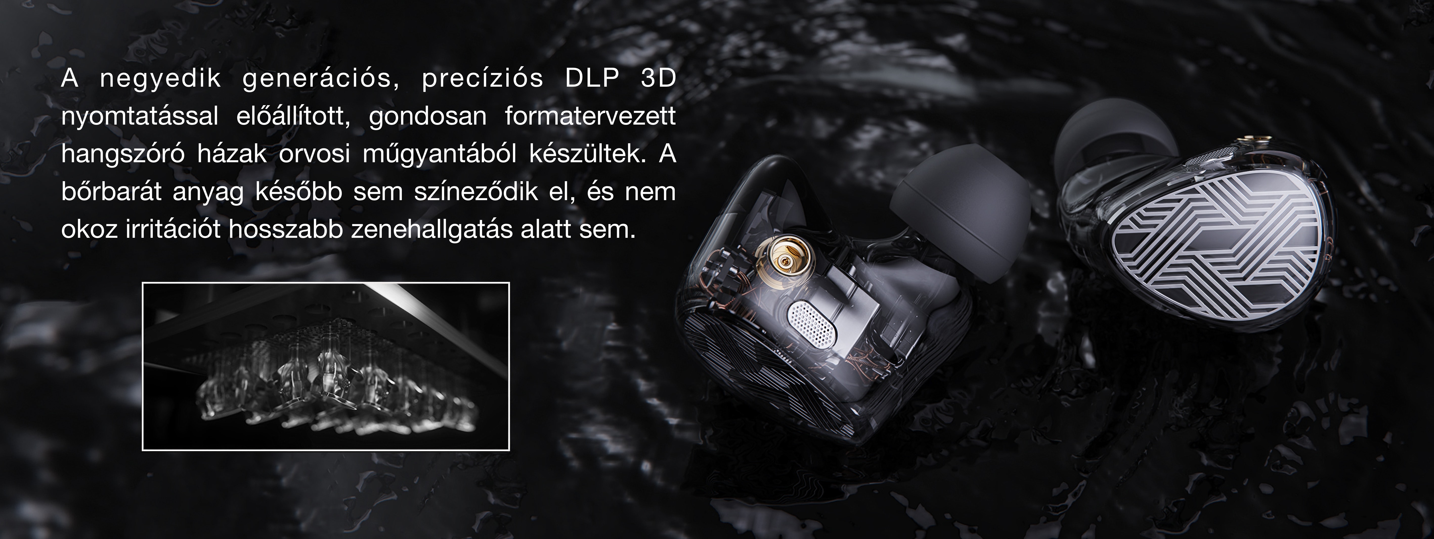 A negyedik generációs, precíziós DLP 3D nyomtatással előállított, gondosan formatervezett hangszóró házak orvosi műgyantából készültek. A bőrbarát anyag később sem színeződik el és nem okoz irritációt hosszabb zenehallgatás alatt sem.