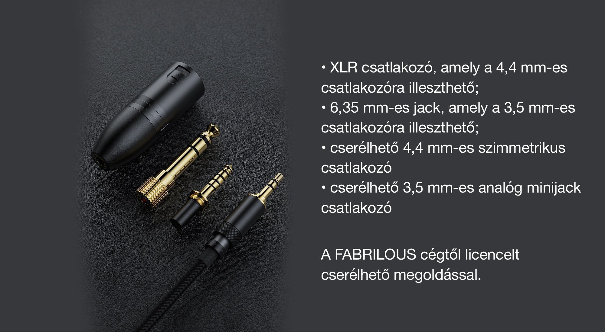 Kábel csatlakozás: 3,5 mm jack a fejhallgató oldalon, a kábel másik végén 4 féle cserélhető csatlakozó (3,5 mm jack, 4,4 mm jack, 6,3 mm jack, XLR 4 pin)