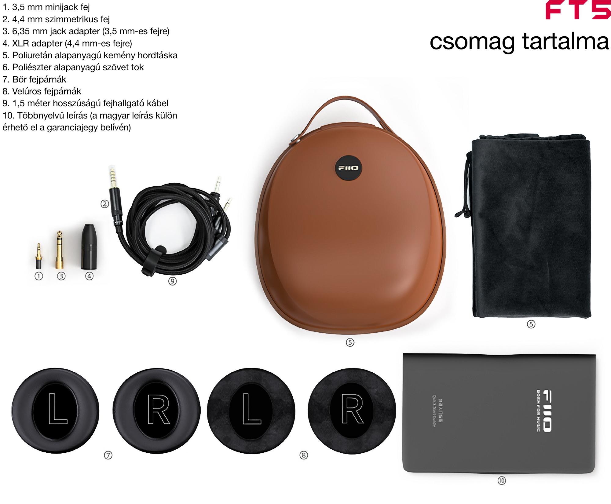 A FiiO FT5 csomagolása a megszokott kiemelkedő élményt biztosítja: a fekete színű doboz lassú vákuumos kinyitásához a dobpergés hiányzik csupán, ez a paraméter is fokozza a várakozásokat, hogy eljussunk a termékig, amelyet egy elegáns, utazásaink során nagyon hasznos barna színű, kemény kivitelű tok tartalmaz.