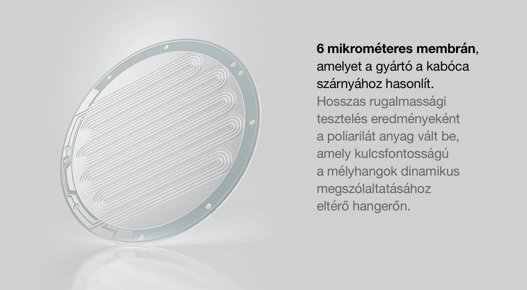 A FiiO stílszerűen a kabóca szárnyainak vastagságához hasonlítja a membrán 6 mikrométeres értékét, amely nem csupán egy szám, hanem nagyon komoly kutatás eredménye: ideális átlaga a teljesítménynek és a tartósságnak. A cég többféle anyaggal is tesztelte a fejhallgató diafragmáját, de végül a poliarilát mellett döntöttek, mert ebben a vékonyságban ez bizonyult a leginkább tartósnak azonos teljesítmény mellett.