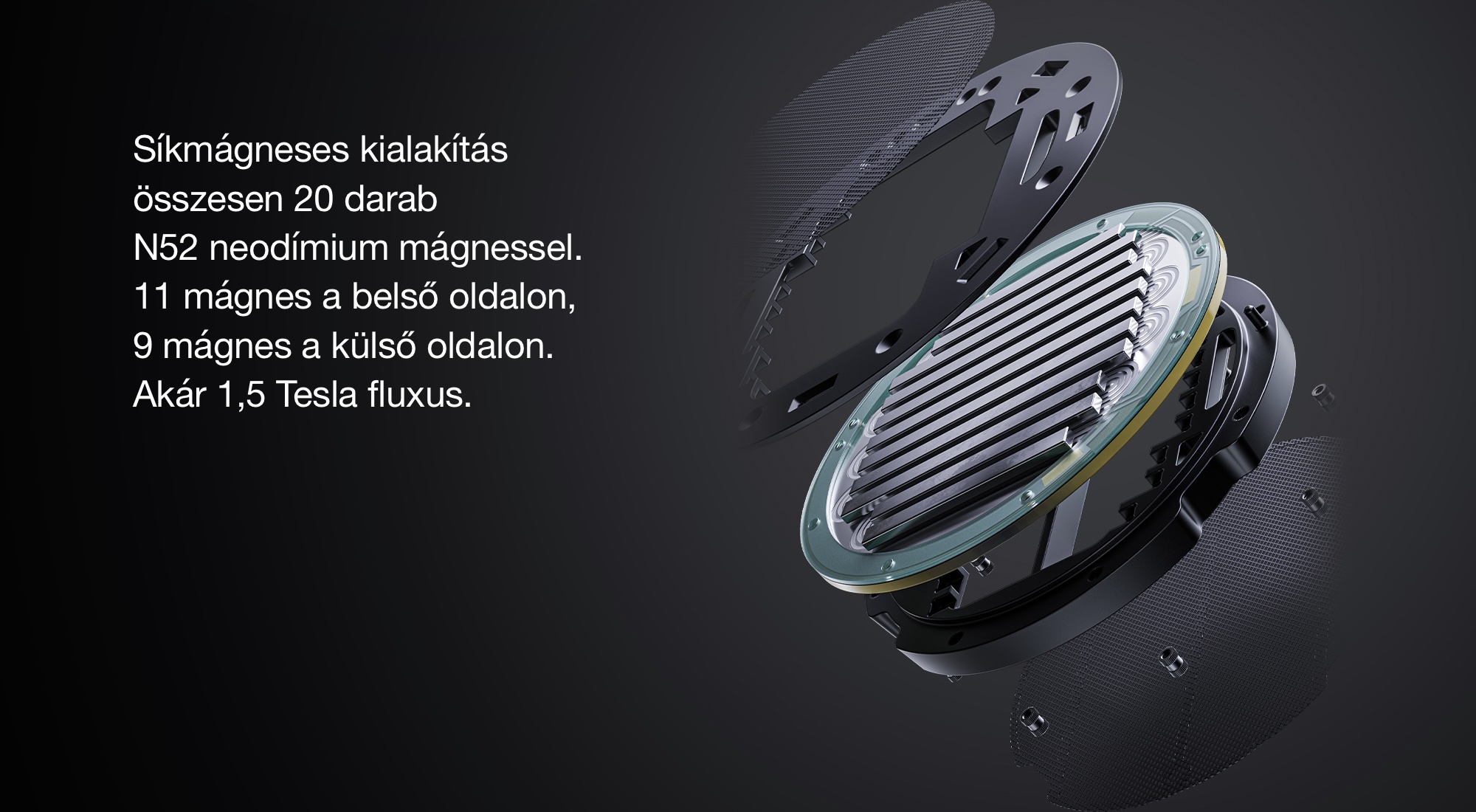Hogy a technikai résztelekbe is belemerüljünk picit: az FT5 egy-egy oldalának belsejében a 90 milliméteres átmérőjű meghajtókban N52 neodímium mágnessor található, amelynek fluxusa akár 1,5 Tesla is lehet, és a kialakítás tizenegy mágnest tartalmazó a belső oldalon, és kilenc mágnest a külső oldalon.
