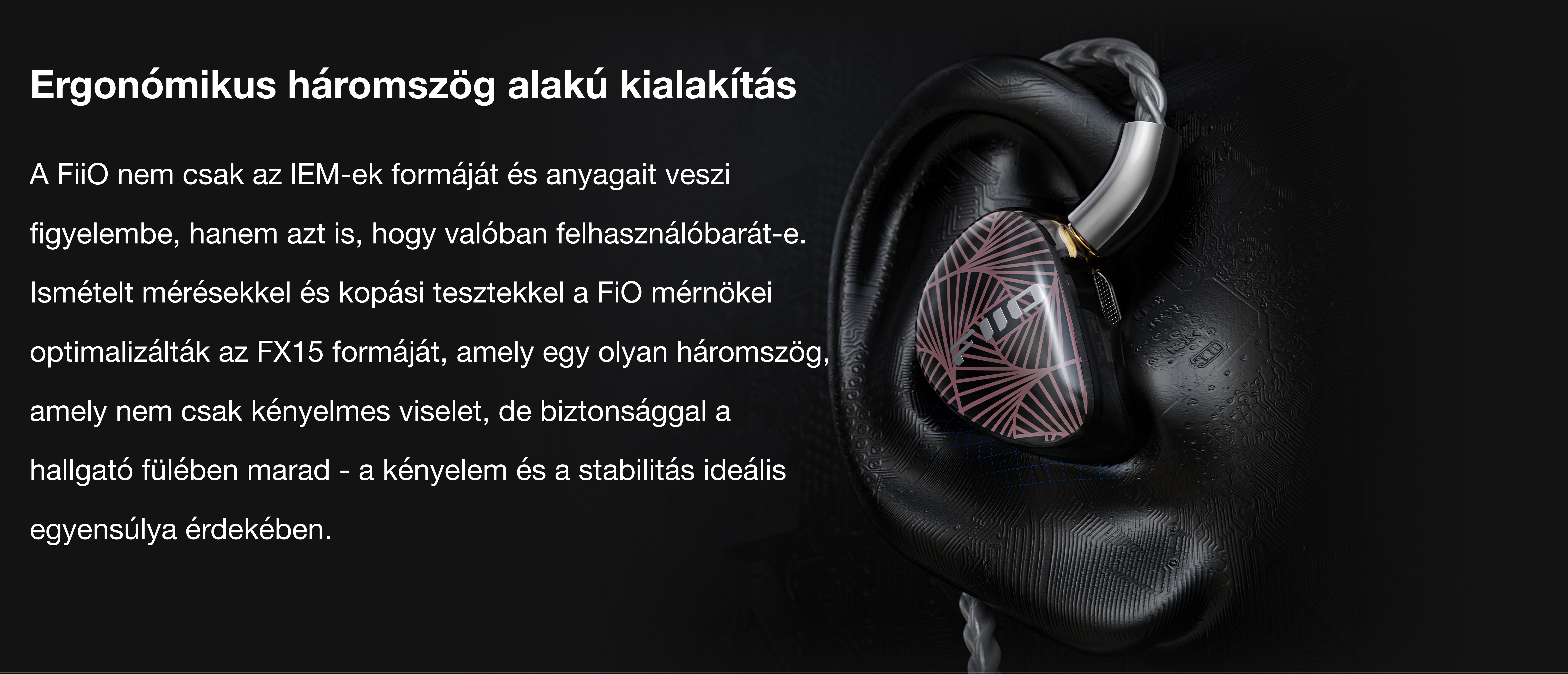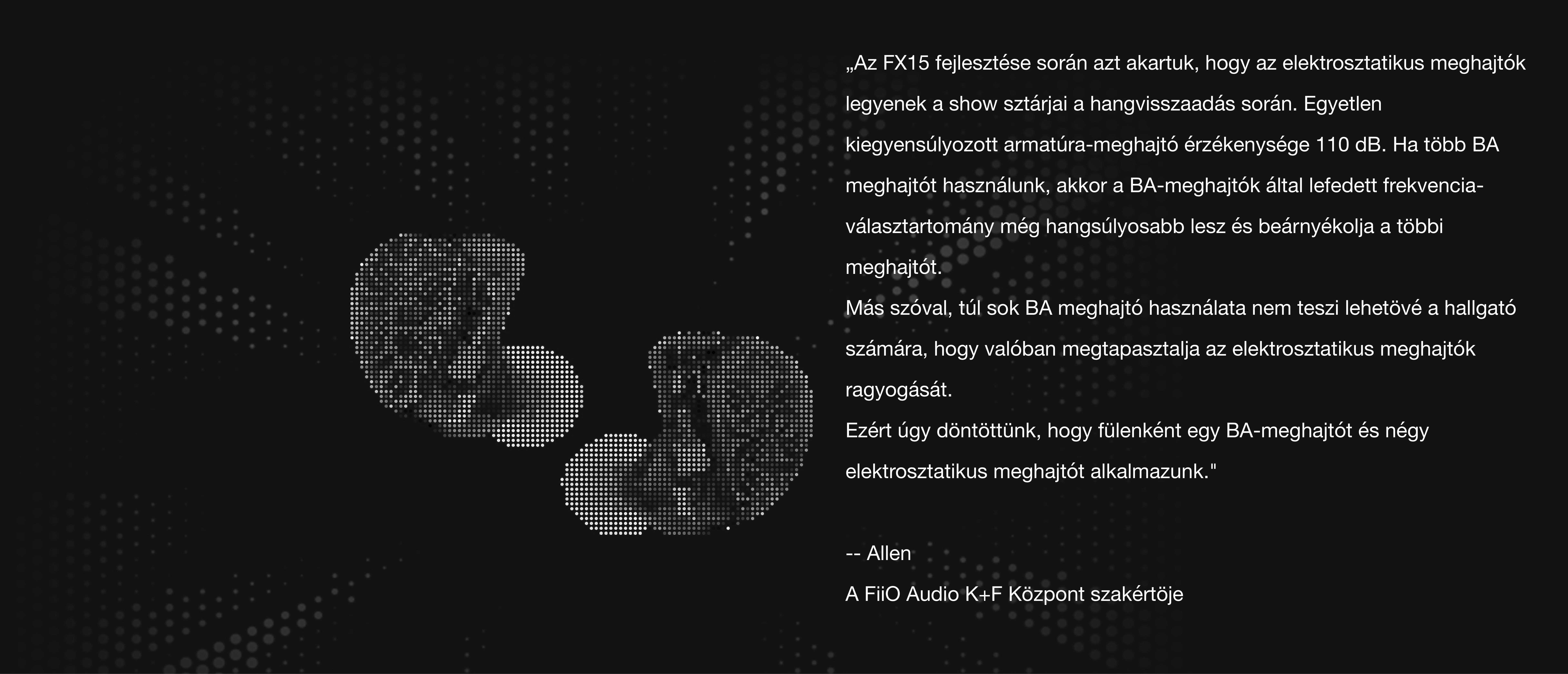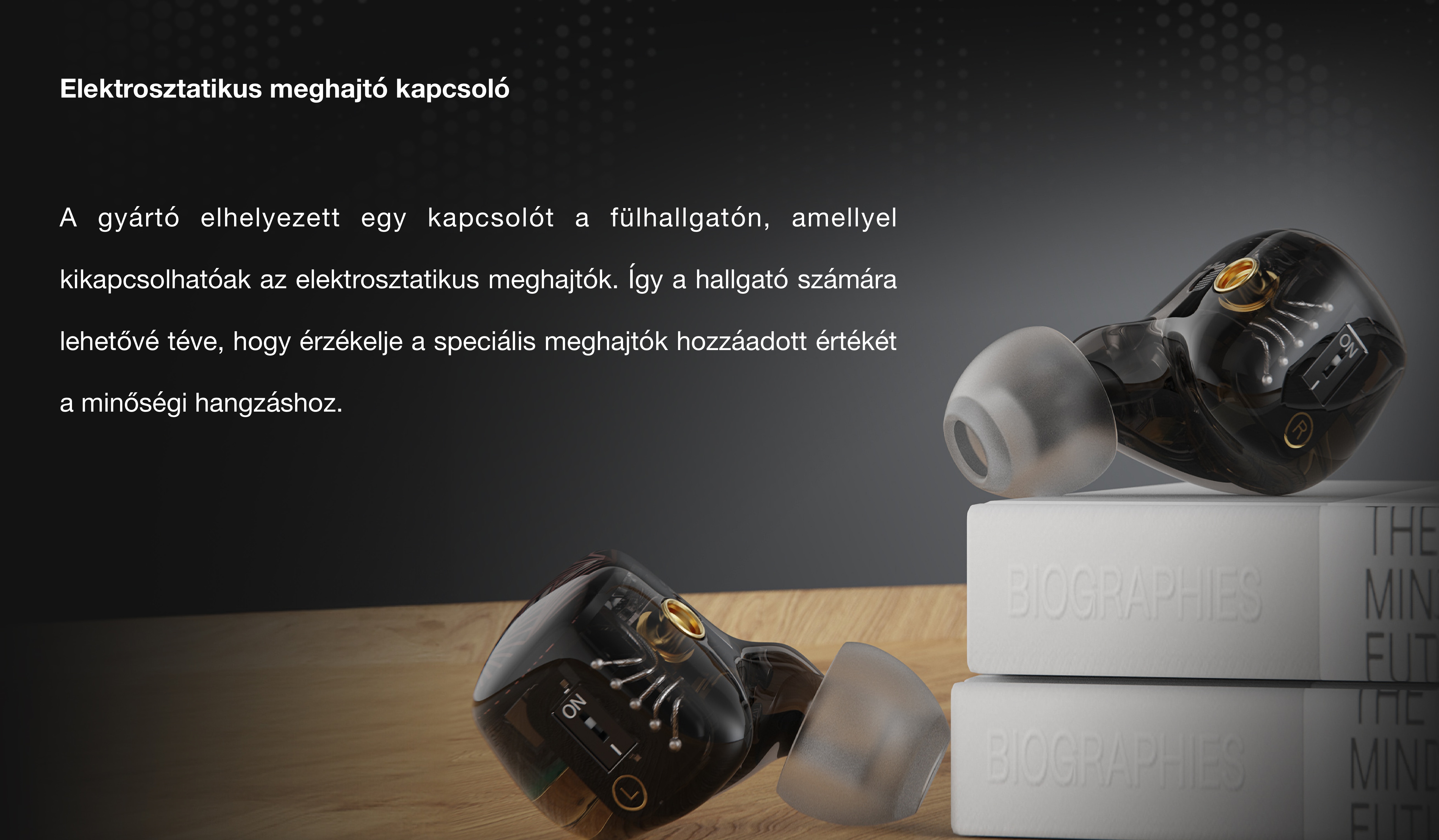 Kialakítás: 1 db dinamikus, 1 db lengőnyelves, 4 db elektrosztatikus meghajtó IEM (hallójárati monitor) fülhallgató