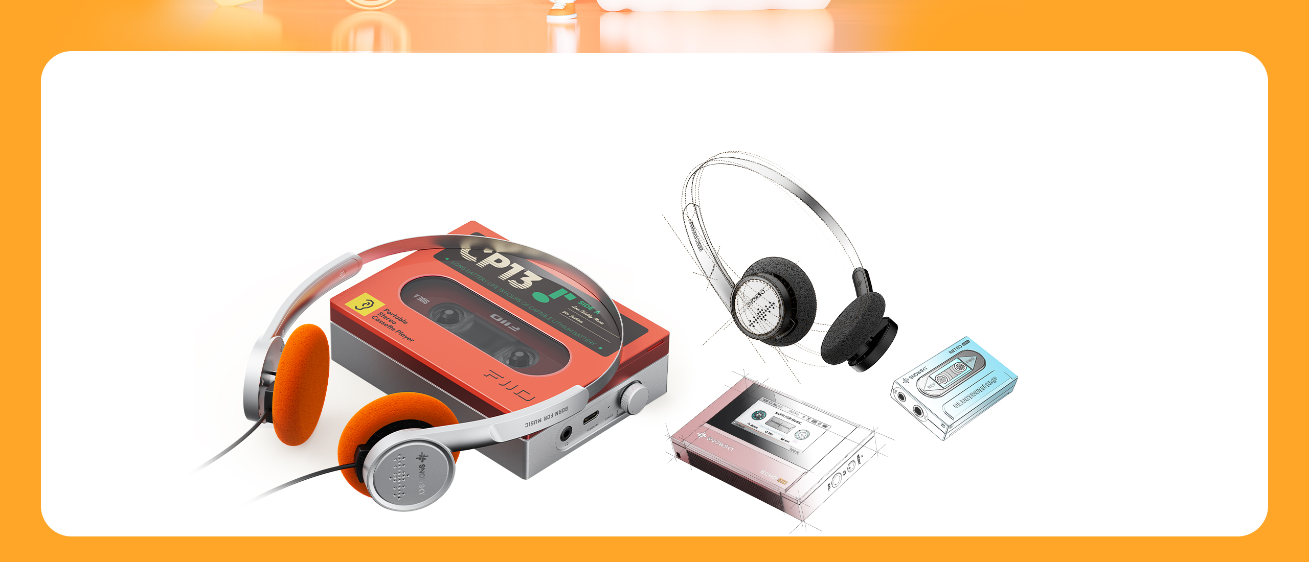 A Snowsky Wind az 1980-as évek sétálómagnóihoz használt, narancssárga fülpárnás fejhallgatók emléke előtt tiszteleg.