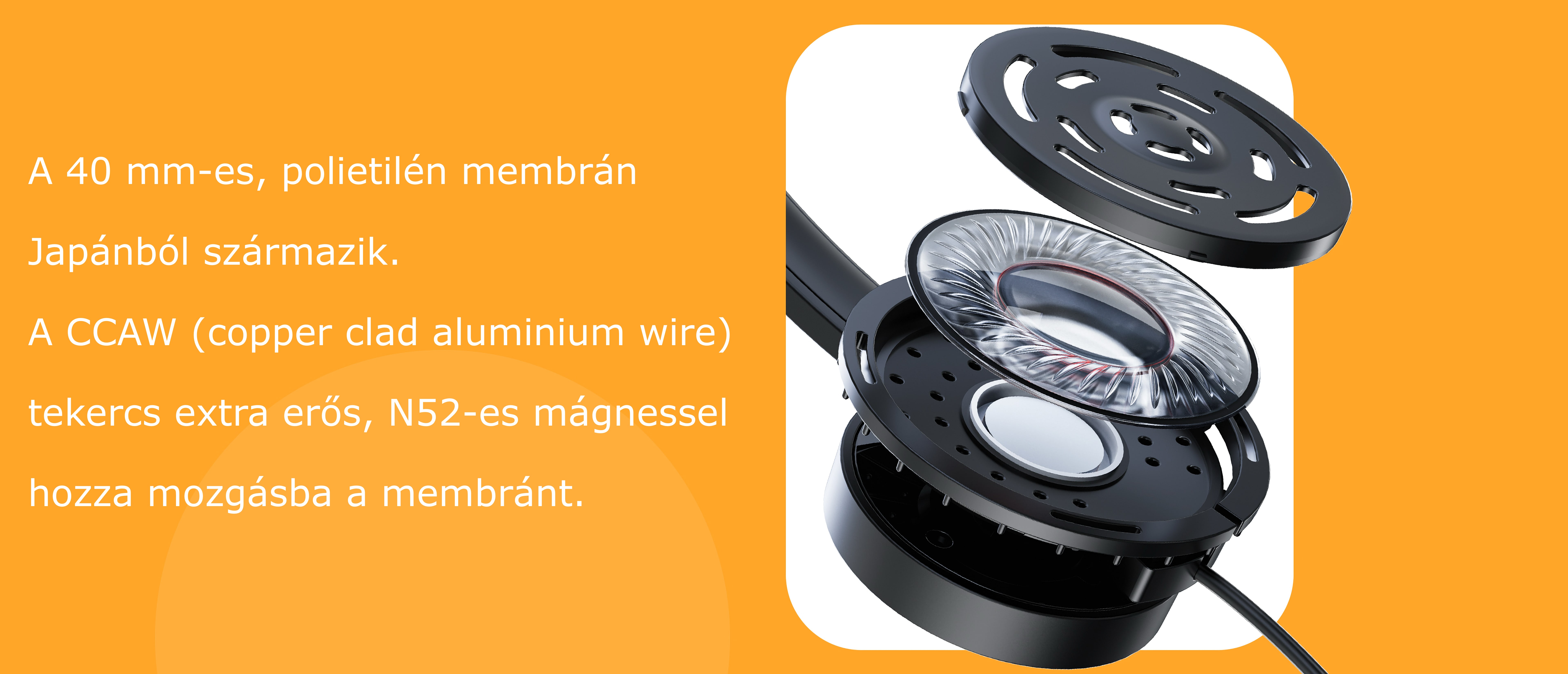 A CCAW (copper clad aluminium wire) tekercs extra erős, N52-es mágnessel hozza mozgásba a membránt.
