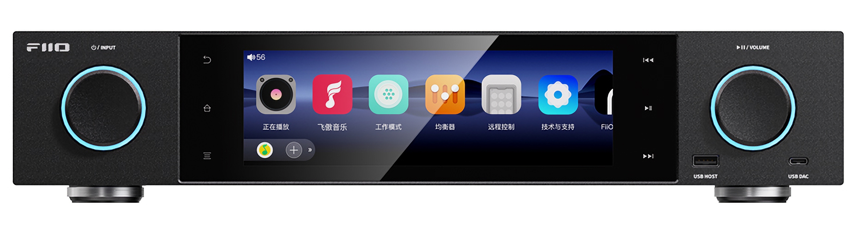 A FiiO S15 előlapján az érintőképernyő mellett megtalálható a hangerő szabályozó és a forrás választó gomb.