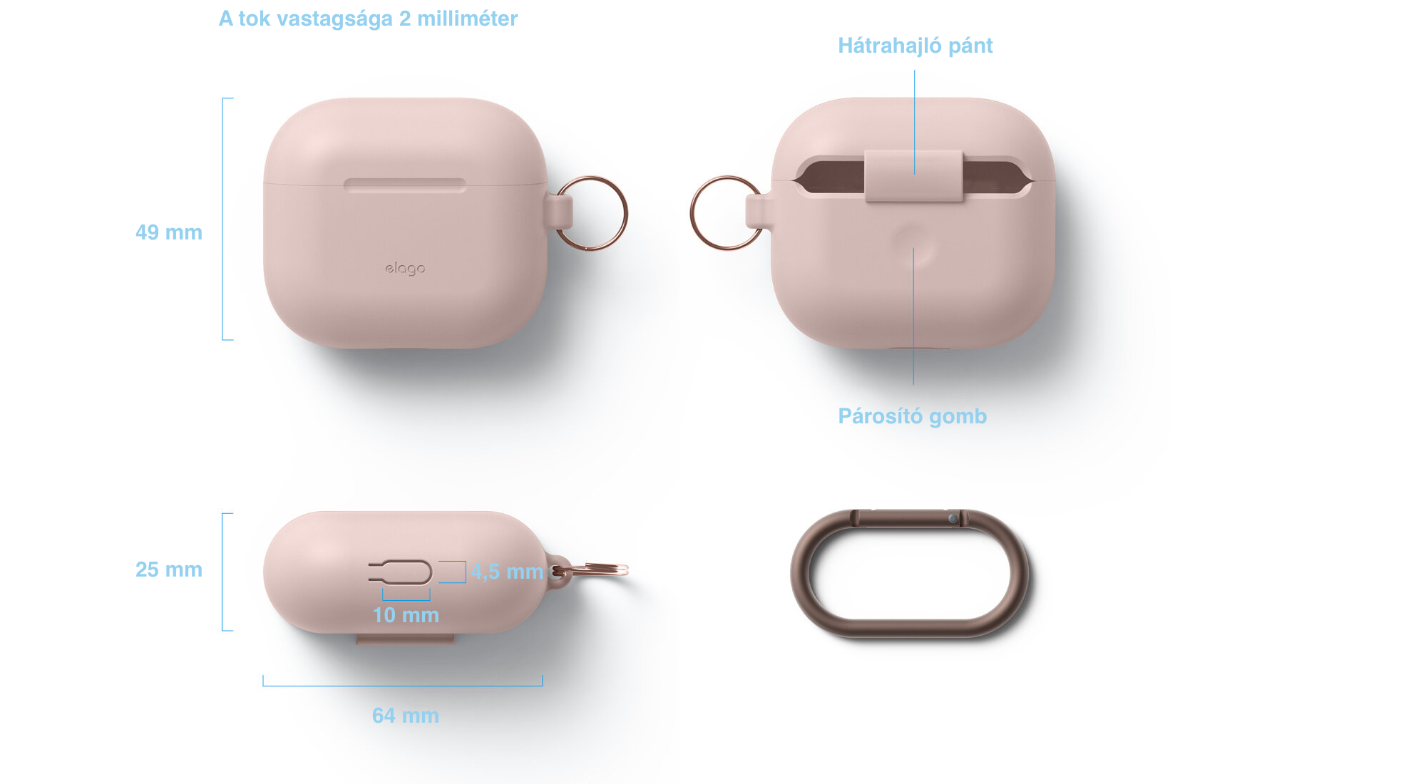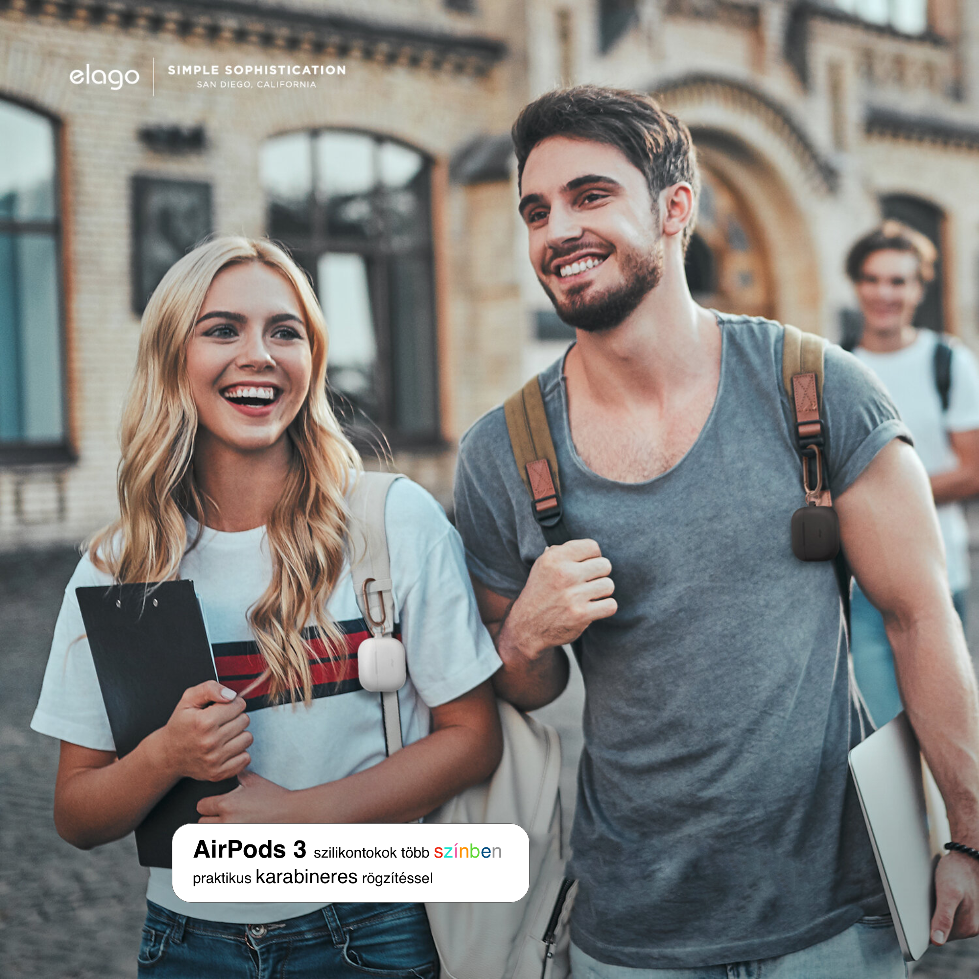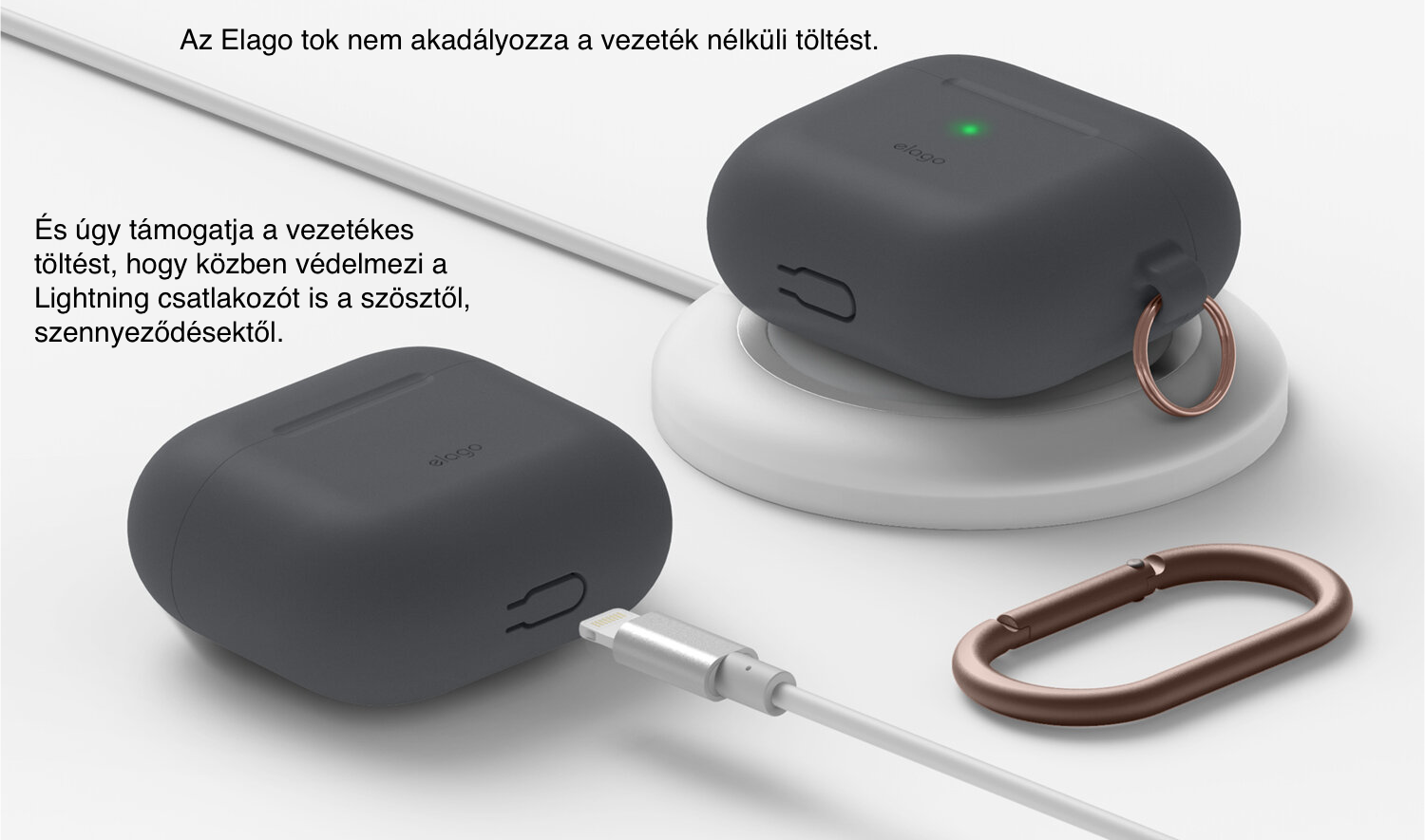 Az Elago AirPods 3 Silicone Hang Case termékvonal változatos színekben érhető el a fehértől a rózsakvarcon és indigókéken át a feketéig. A tok kialakítása jót átgondolt: hozzáférhetővé teszi, de el is fedi a Lightning csatlakozót, hogy azt védje a szennyeződésektől. A felső része nem csak rácsúszik a tok tetejére, hanem egy egységet képez a tok alsó részével, így az elveszítés esélye jelentősen lecsökken számos más tokhoz képest, amelynek egyszerűen csak rászorul a felső része a kupakra, ám ezáltal le is tud csúszni róla.