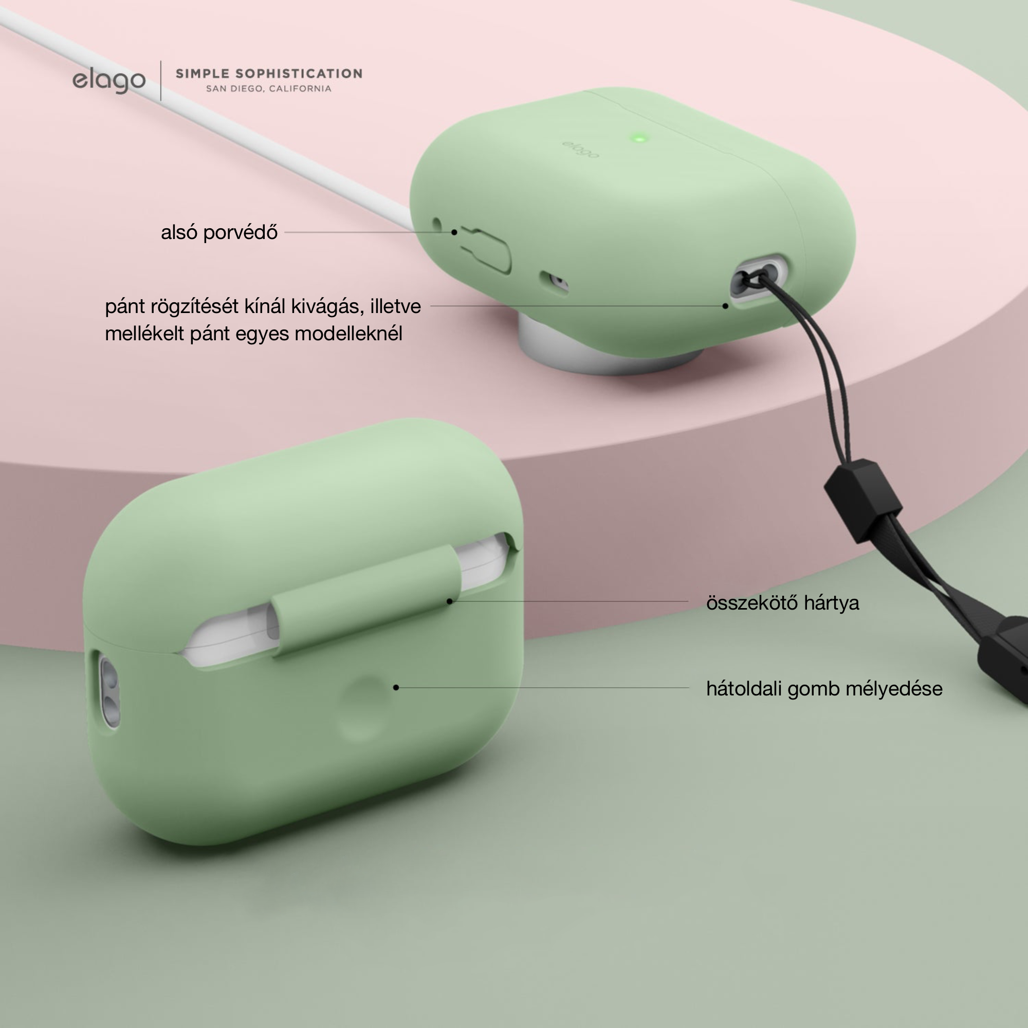 Az Elago AirPods Pro Silicone Case termékvonal változatos színekben érhető el a fehértől a rózsakvarcon és indigókéken át a feketéig. A tok kialakítása a vékonyságot és védelmet tartja szem előtt. Hozzáférhetővé teszi a Lightning csatlakozót. A felső része rászorul a tok tetejére, és egy vékony hártya révén egy egységet képez a tok alsó részével, így könnyítve a felnyitást, és biztosítva azt, hogy a tok teteje ne járjon le az AirPods Pro tok kinyitható részéről.