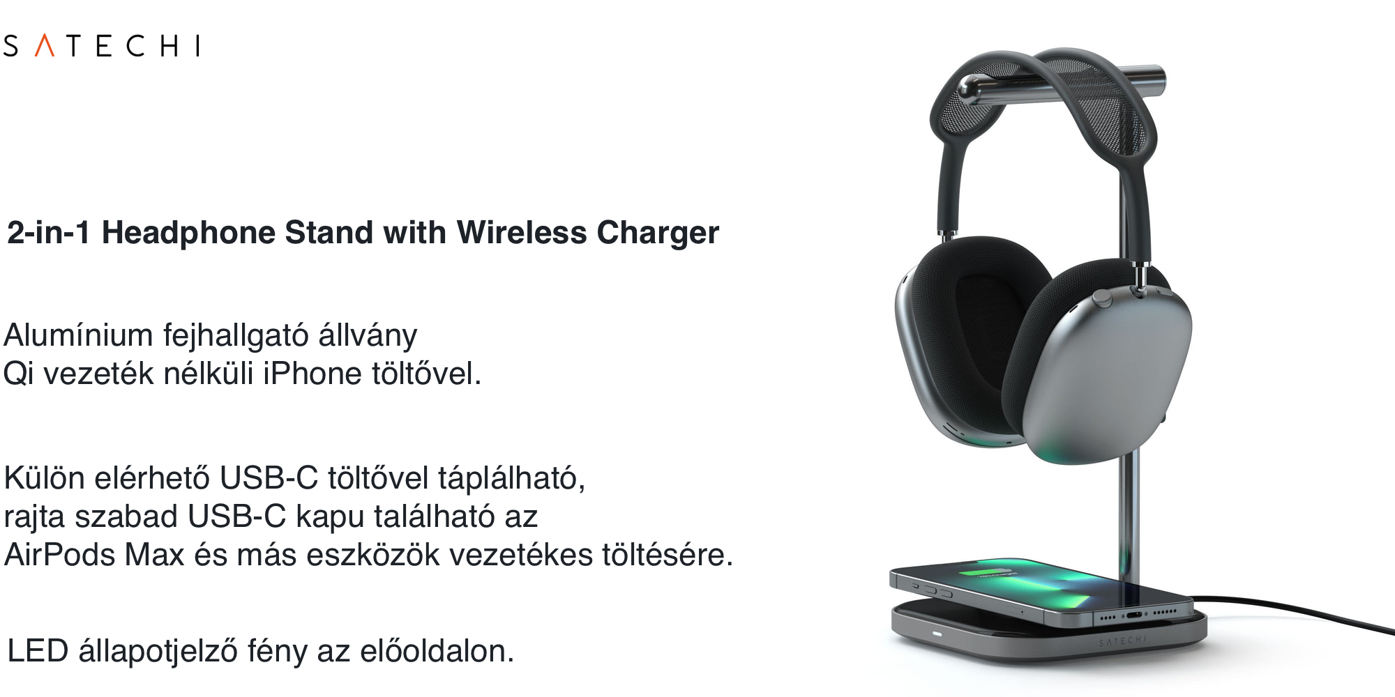 Az AirPods Max elegáns asztali tárolására és töltésére is alkalmas a Satechi 2-in-1 Headphone Stand with Wireless Charger nevű terméke, amely USB-C bemenete és töltő kimenete mellett beépített Qi töltővel is rendelkezik az iPhone és az AirPods Pro számára. A konstrukció elegáns anyagválasztása révén tökéletes megjelenést biztosít az Apple eszközökkel teli ökoszisztémában.
