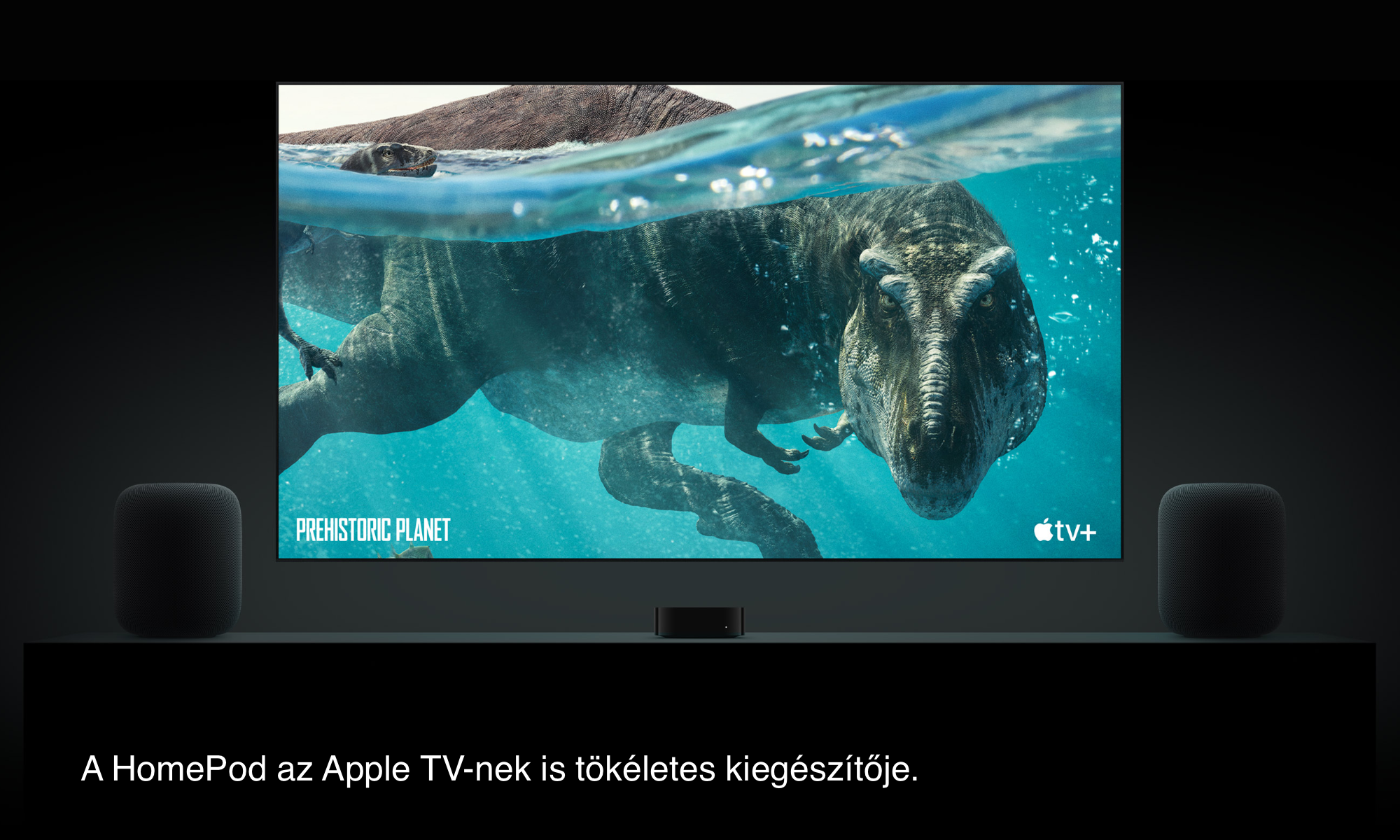 A HomePod párban elhelyezve a televízió közelében az Apple TV-vel párosítva lenyűgöző Dolby Atmos hangzásra képes. A hangszórók által alkotott virtuális tér a házimozi élményvilágot idézi, az Apple saját készítésű adásai, filmjei, sorozatai révén pedig kiváló minőségű nyersanyagok is rendelkezésünkre állnak. (Az Apple TV+ előfizetéses szolgáltatás, amelynek havi díjai vannak. Internet kapcsolaton keresztül működik.)