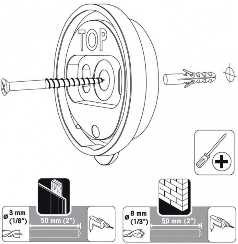 A kicsiny tartó kétféleképpen rögzíthető a falon: az egyik módszer a ragasztás, ha nem szeretnénk fúrni. Ekkor a csomagban lévő fekete színű gyűrűt kell tiszta, zsiradék- és pormentes felületre illeszteni, jól rányomni, és várni 24 órát, amíg a ragasztó kellően megköt!