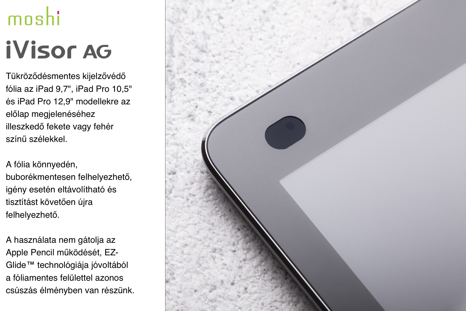 A Moshi iVisor AG iPad Pro 10,5” és iPad Pro 12,9”, az iPad 9,7” modellekhez alkotott változatai ideális megoldást nyújtanak az iPad felhasználók számára, hiszen a készüléket a legkülönfélébb helyszíneken használjuk, ahol a tükröződés felmerülhet, mint használati élményt befolyásoló paraméter.