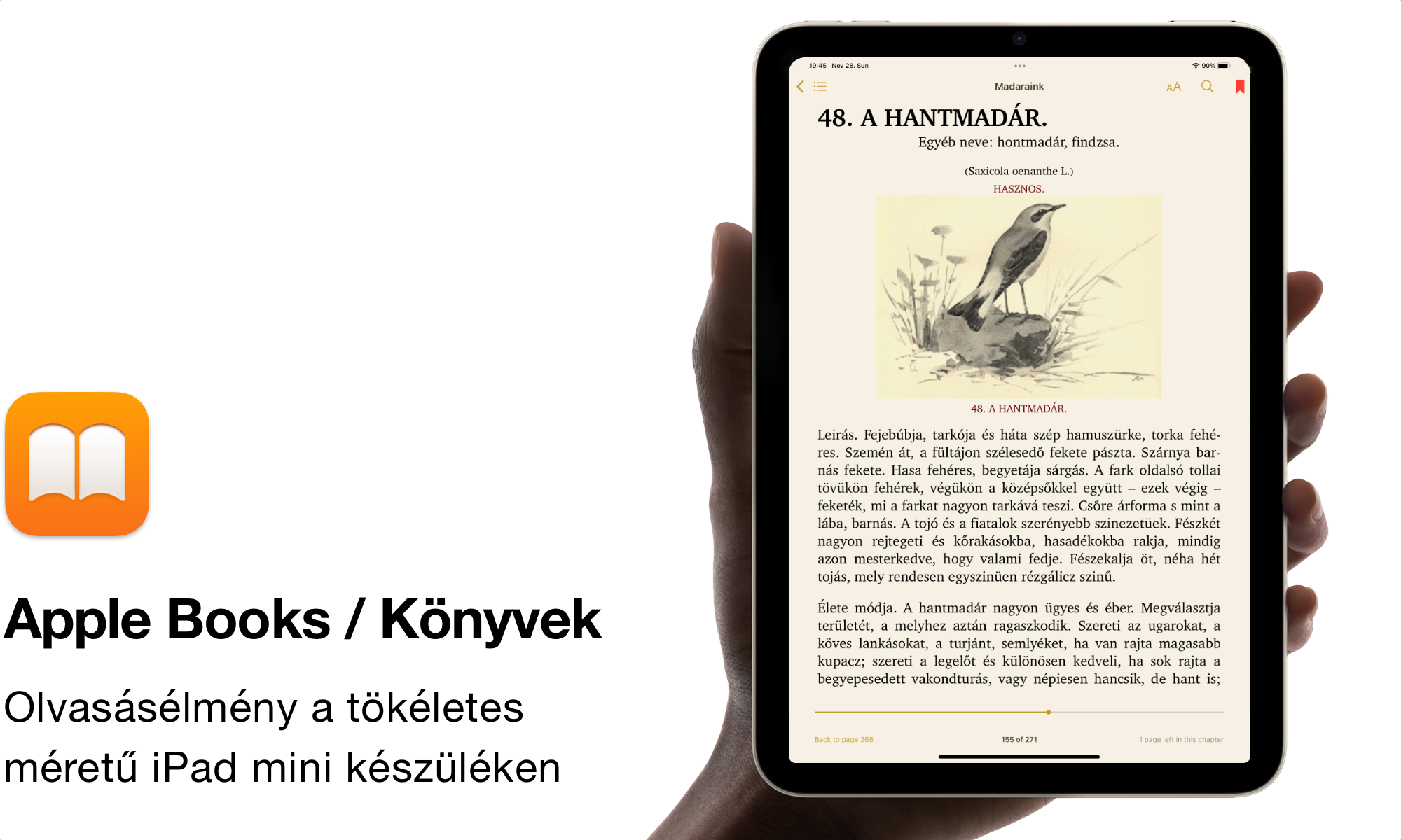 Ehhez társul egy remekül átgondolt alkalmazás, az Apple Books, amely segítségével gyűjthetjük és mindig magunknál tárolhatjuk a kedvenc műveinket. Szeretnénk megosztani valakivel egy Jókai idézetet, de nem emlékszünk rá pontosan? Netán felolvasnánk a kedvenc Byron versünket? Vagy csak egy aktuálisan tanult szoftver szakkönyvét böngésznénk? Az iPad mini és az Apple Books minderre remek megoldás, hiszen egy egész könyvtárat magunkkal vihetünk papírlapok nélkül.