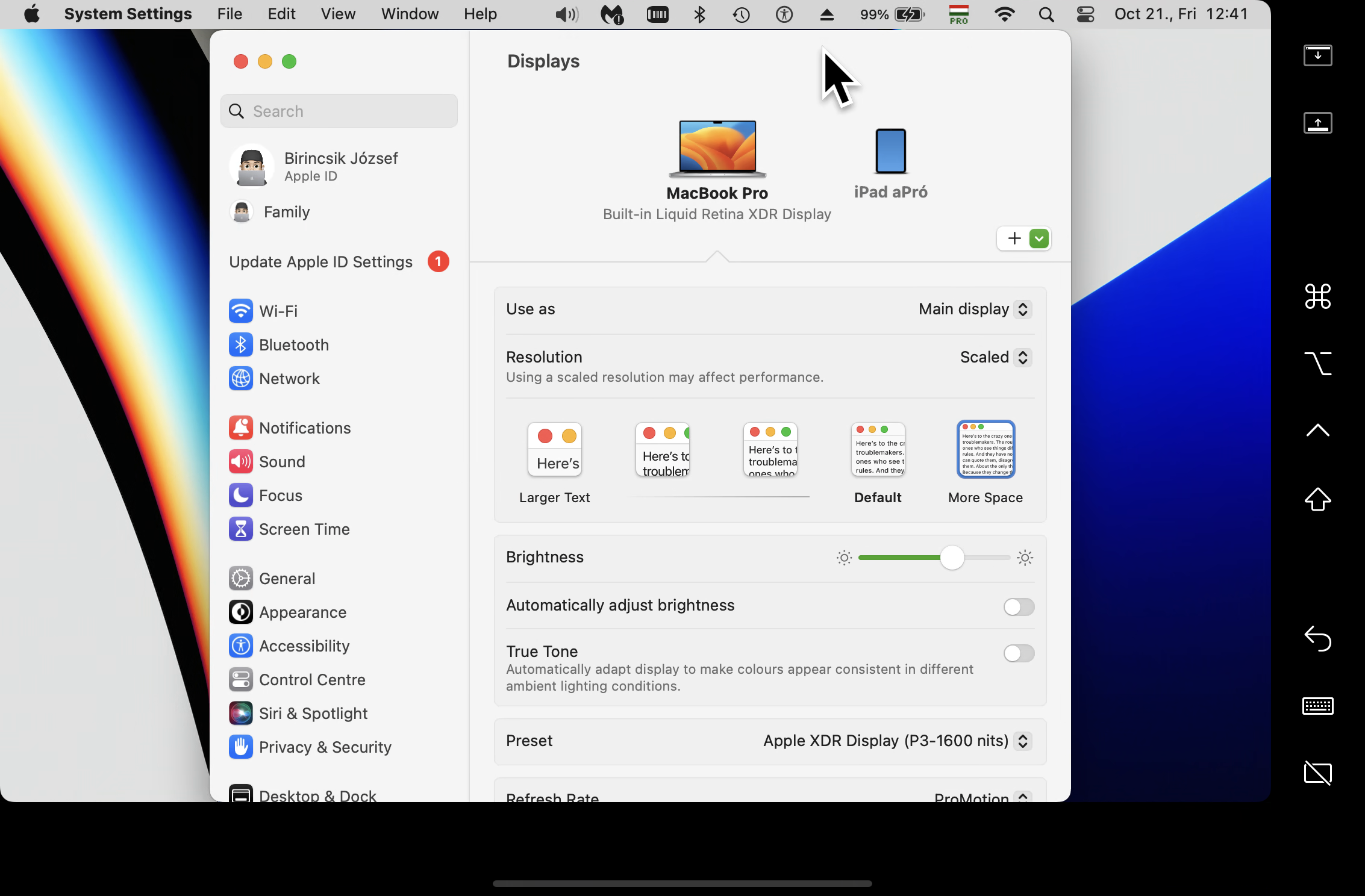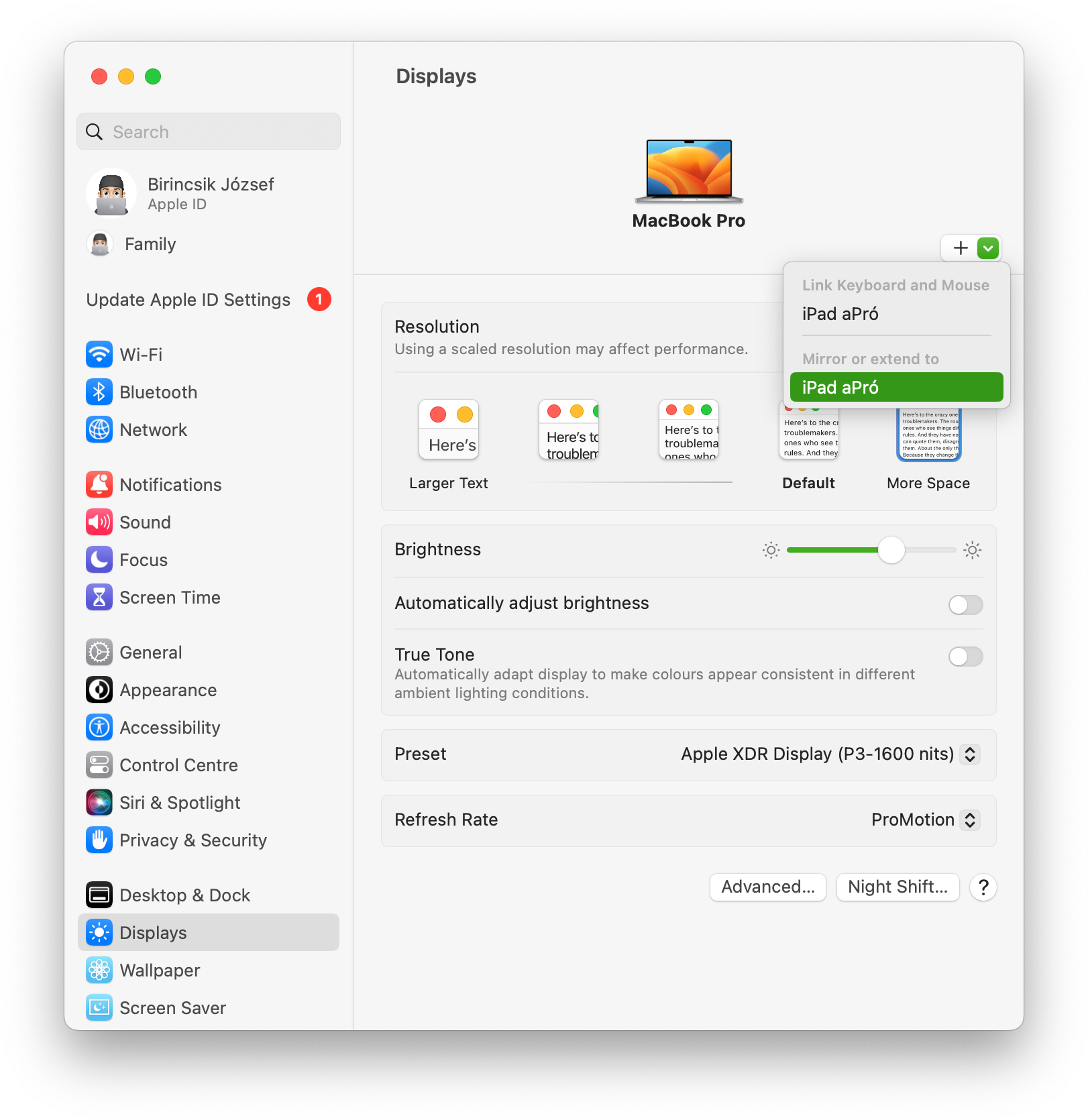 A Mac rendszeren a System Settings / Rendszerbeállítások program Displays / Kijelzők felületén van lehetőségünk kiválasztani a cél eszközt, így például iPad mini készülékünket. A Devices / Eszközök menüben megtaláljuk a készüléket, illetve végrehajthatunk pár apróbb finomhangolást, így a Sidebar / Oldalsáv megjelenését, amely számos hasznos és praktikus funkciót tartalmaz, a Touch Bar elhelyezését, amely a MacBook Pro tulajdonosok számára alapvető funkciófelület, illetve bekapcsolhatjuk a birtokunkban lévő Apple Pencil Pro által támogatott dupla koppintást is.