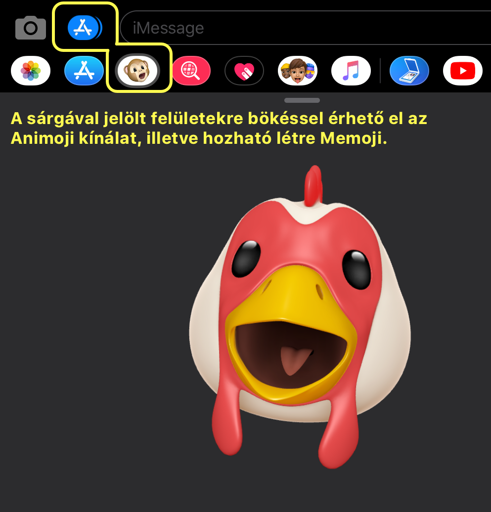 A Messages / Üzenetek alkalmazás szövegmezője alatt az alkalmazás extrák felületen a kis majom ikonra bökve érjük el az Animoji képességet, amelyen balra görgetve találjuk a plusz jelet, amellyel új Memoji karaktert hozhatunk létre. Itt saját énképünknek megfelelő paraméterek közül válogathatunk: a hölgyek sokféle hajviseletet, ruhadarabot, divatos napszemüveget, szép szemszínt állíthatnak be maguknak, míg a férfiak számos szakáll és bajusz divat közül is válogathatnak.