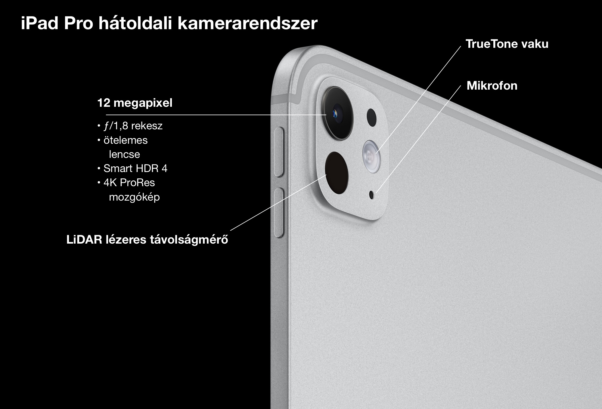 Az okos előoldali kamera mellett az iPad Pro lenyűgöző képességeit a hátoldali kamerarendszer adja, amely egy nagy látószögű, kiemelkedő érzékenységű lencsét és egy LiDAR lézeres távolságmérőt tartalmaz. Ezek együttes információit képes az Apple Silicon processzor feldolgozni és a látott képi információt fokozni.