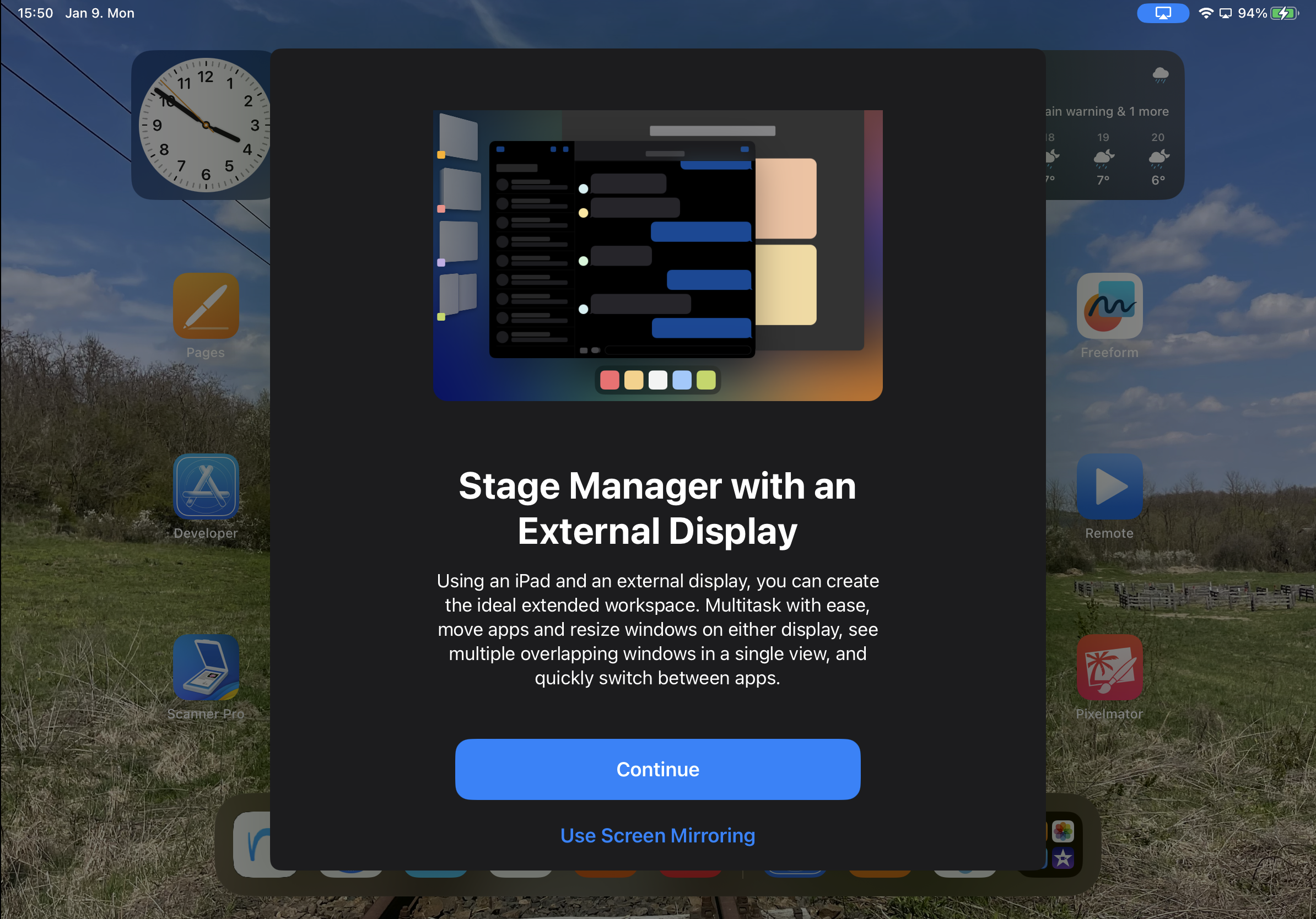 A külső kijelző csatlakoztatását követően rögtön egy lebegőablak köszönti a felhasználót, amely felhívja a figyelmet a Stage Manager / Porondmester képességeire, illetve lehetőség ad a klasszikus tükrözésre is, ha az a cél a külső kijelzőn.