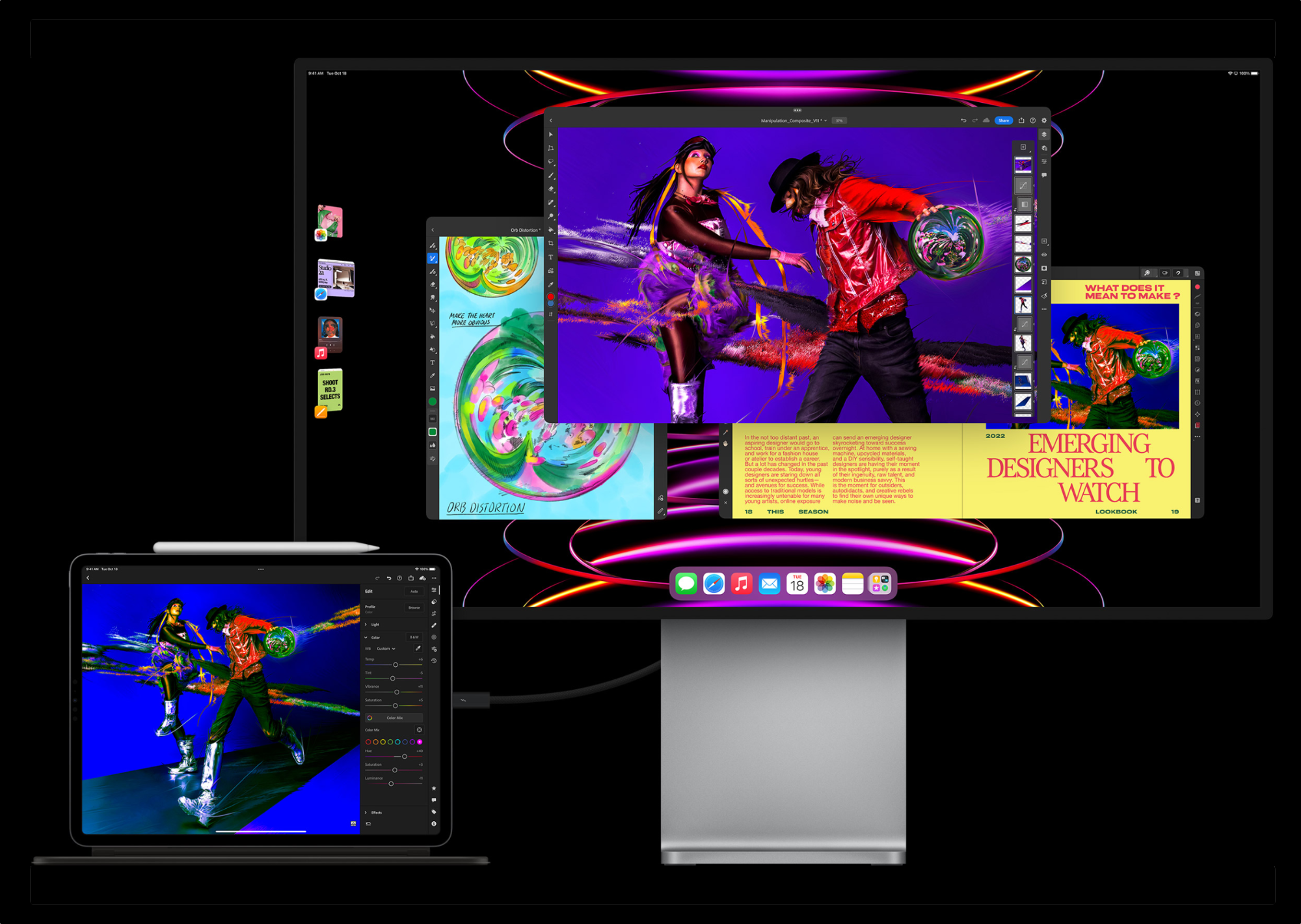 Az iPad Pro grafikus teljesítménye olyan nagy, hogy simán működik róla egy Apple Pro Display XDR 6K felbontású kijelző is. Külső egérrel és billentyűzettel kiegészítve, vagy az Apple által az iPad Pro mellé gyártott Magic Keyboard terméket használva pedig nem csak kiterjeszti az iPad Pro kijelzőjét például videó lejátszáshoz, hanem úgy használhatjuk, mint egy Mac-et: az egérkurzor segítségével megragadhatunk, húzhatunk, kijelölhetünk, a billentyűzet révén pedig a gépelés mellett a klasszikus billentyűparancsokat is elérjük, miközben ott van a kezünk ügyében az iparág legjobb érintőkijelzője is, ha olyan alkalmazást használunk, amelyen a rajzolás és a többujjas érintések alkalmazása nyújtja a jobb használati élményt.