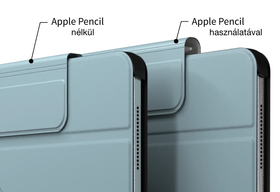 Hatalmas előnye ugyanakkor a SwitchEasy Origami Protective Case jelentette felhasználói helyzetnek, hogy a termékkel kompatibilis első generációs Apple Pencil, amely semmilyen módon nem tapad magabiztosan az iPad modellhez, a tok révén dedikált tartó résszel rendelkezik, ahonnan nem hullik ki, és a táskában való mozgásával nem meríti saját és az iPad akkumulátorát. (Való igaz, hogy az Apple Pencil 1. generáció az iPad előlapjának jobb oldalán lévő mágnesek révén képes megtapadni az iPad felületén, ez azonban inkább csak véletlen jelenség, és nem hivatalos hordozási mód.) A SwitchEasy Origami Protective Case egy becsúsztató hurokban helyezhető el, illetve a tok előlapját stabilan megtartó mágneses pánt is átfedi, így biztos a védelme.