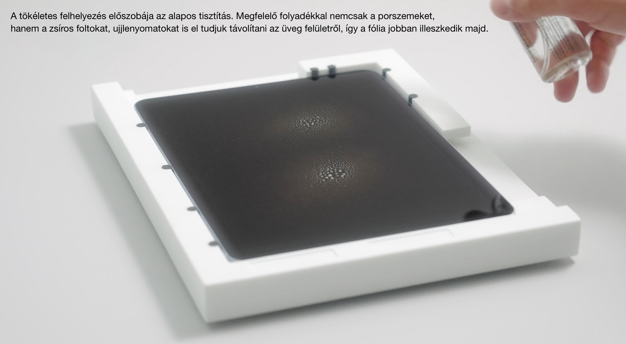 Tipp: A szösz eltávolító ragasztót kettő darab zsírpapír fedi. Érdemes csak az egyiket eltávolítani, ha mégis szennyeződés maradna a fólia alatt, a másik tisztán maradó résszel azt a fólia felemelése mellett még el tudjuk távolítani. Egy-két felemelést a fólia ragasztóanyaga még tolerál, így a makacsul becsúszó szennyeződéseket lehetőségünk van eltávolítani, és nem kell együtt élni az alattomos buborékokkal a kijelzőn.
