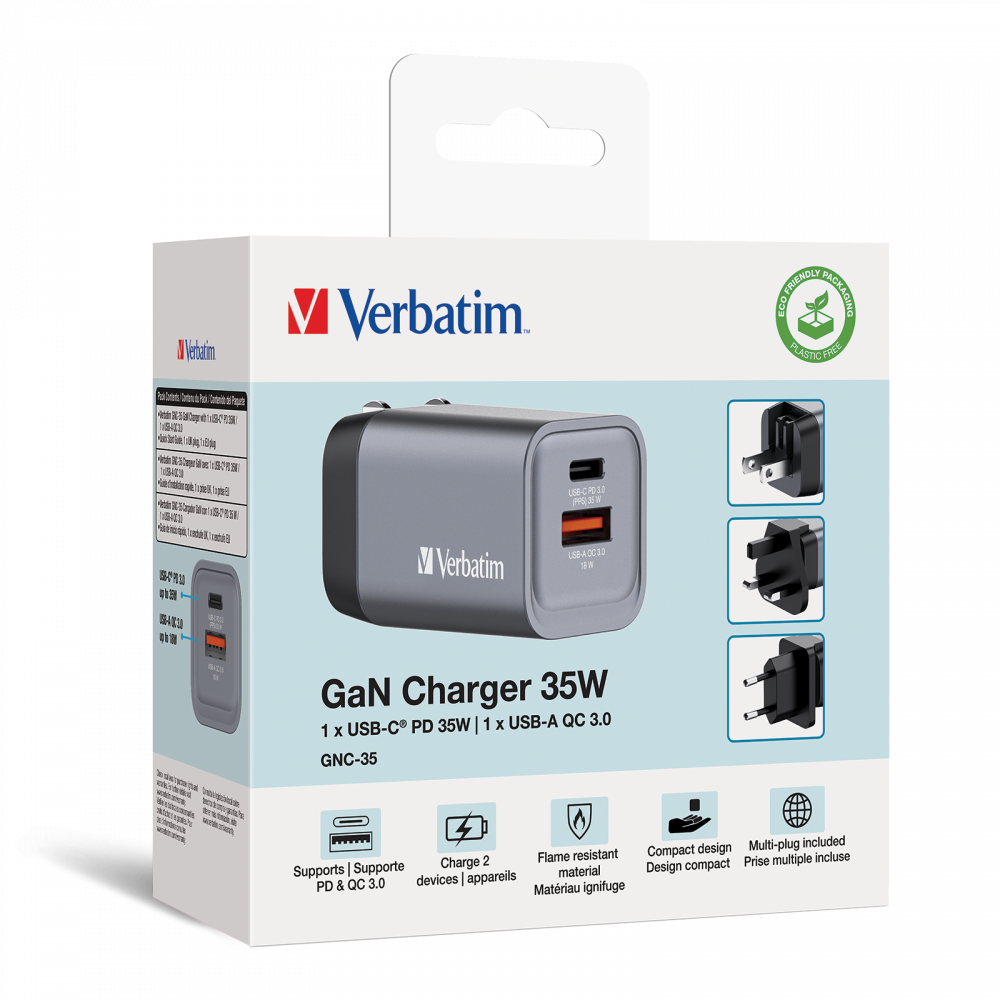 A Verbatim 35 wattos kettő az egyben töltő megoldás aprócska mérete révén könnyedén elfér akár egy női kézitáskában is, és tökéletes megoldás kettő eszköz egyidejű töltésére. Már alapból három régiót támogat: kihajtható amerikai dugói, illetve felhelyezhető európai és brit dugói vannak, vagyis külön befektetés nélkül meg van oldva az utazó töltő feladatköre is vele.