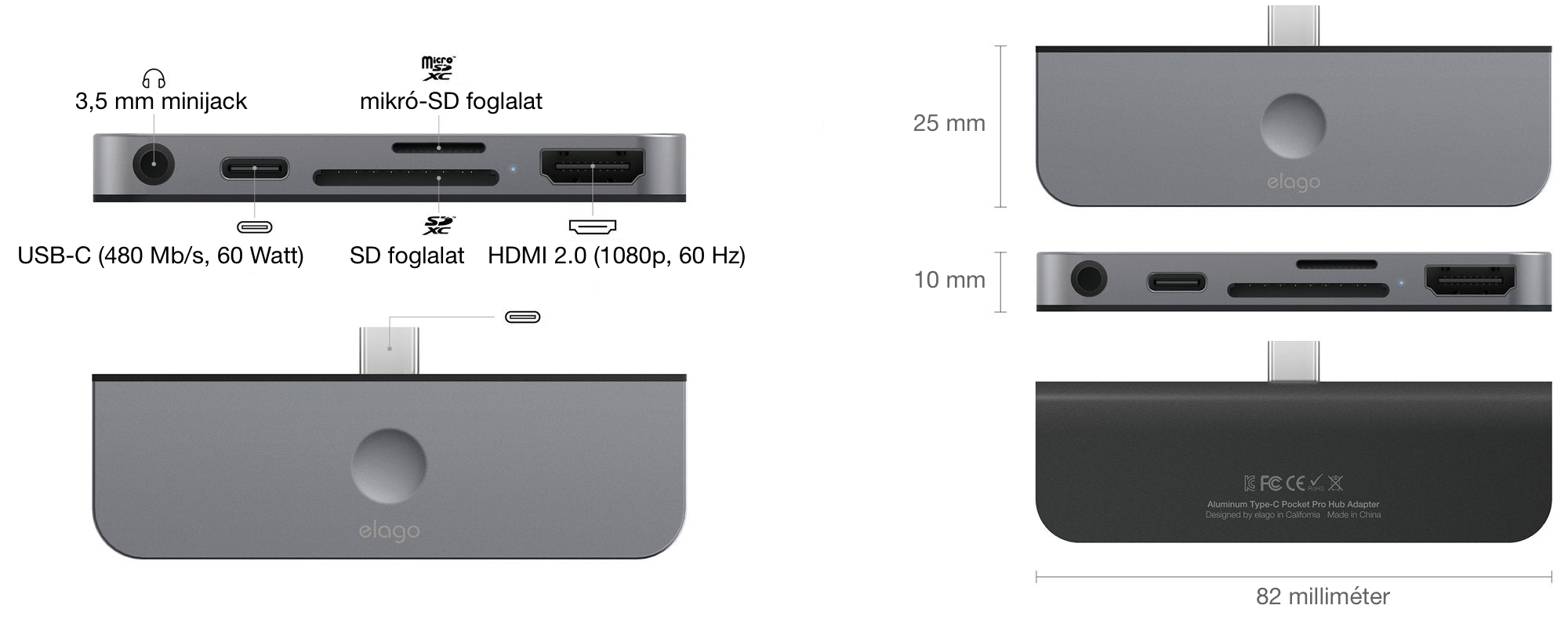 Az Elago Aluminium Type-C Pocket Hub rendkívül kis méretű, így utazó táskánk egy szűkebb zsebében is kényelmesen elfér. Használat közben sajnos egy fehér LED világít rajta, tehát némileg megtöri a készülék saját használati élményét, ám hasznos funkciókkal egészíti ki azt. Az iPad Pro modellek ezüstszürke és sötétszürke színében érhető el.